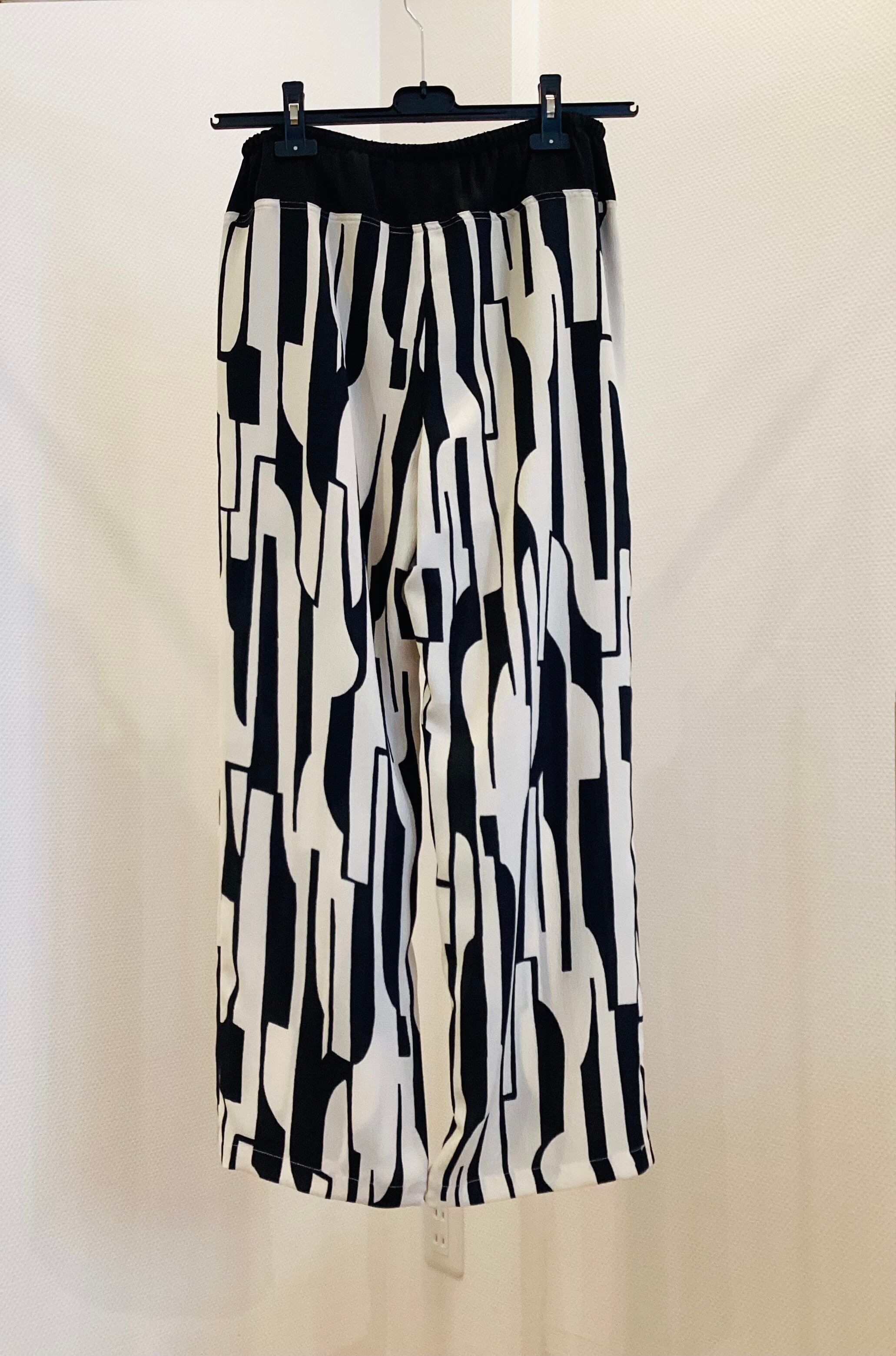 幾何学柄が目を引くドロストパンツは、穿くだけで洗練されたモードな印象に。