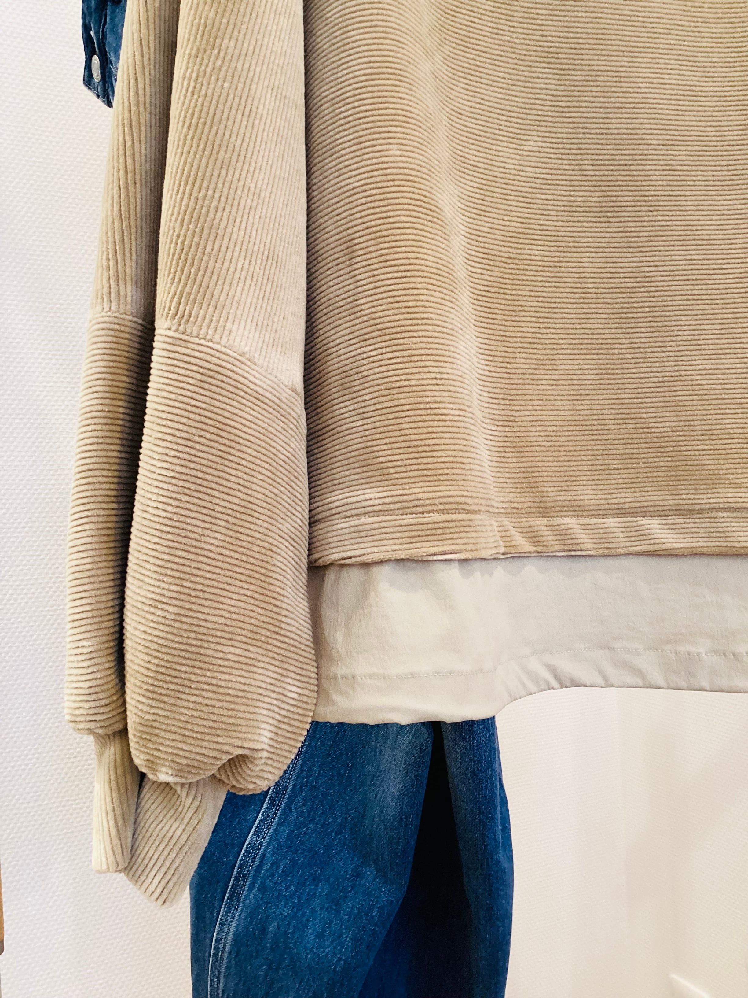 ふっくらとした太畝コーデュロイ調のニット素材が、ウォーム感とリッチな雰囲気をプラス。