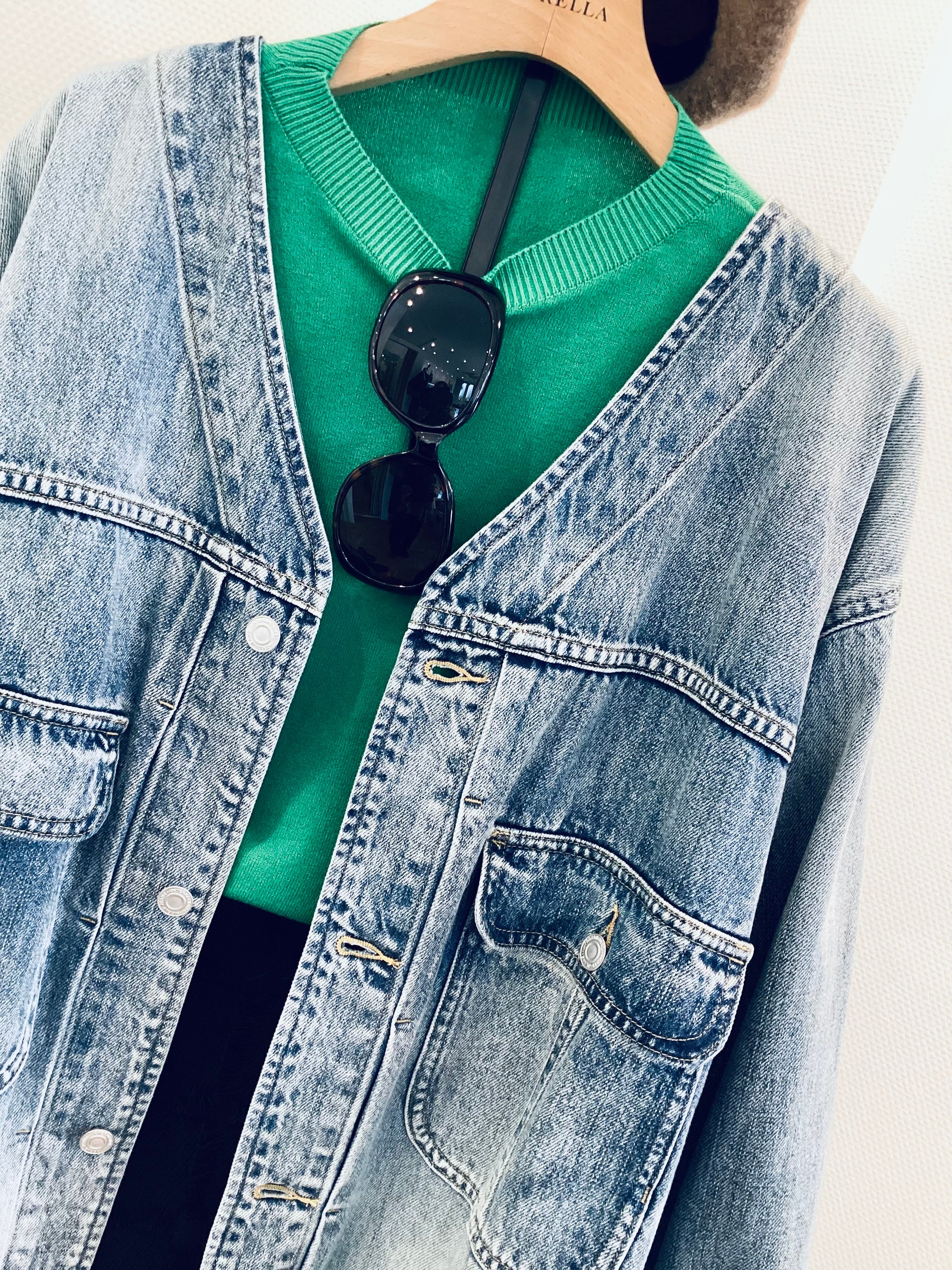 カジュアルなデニム素材を、ノーカラーのVネックでクリーンかつ女性らしい印象に昇華‼︎