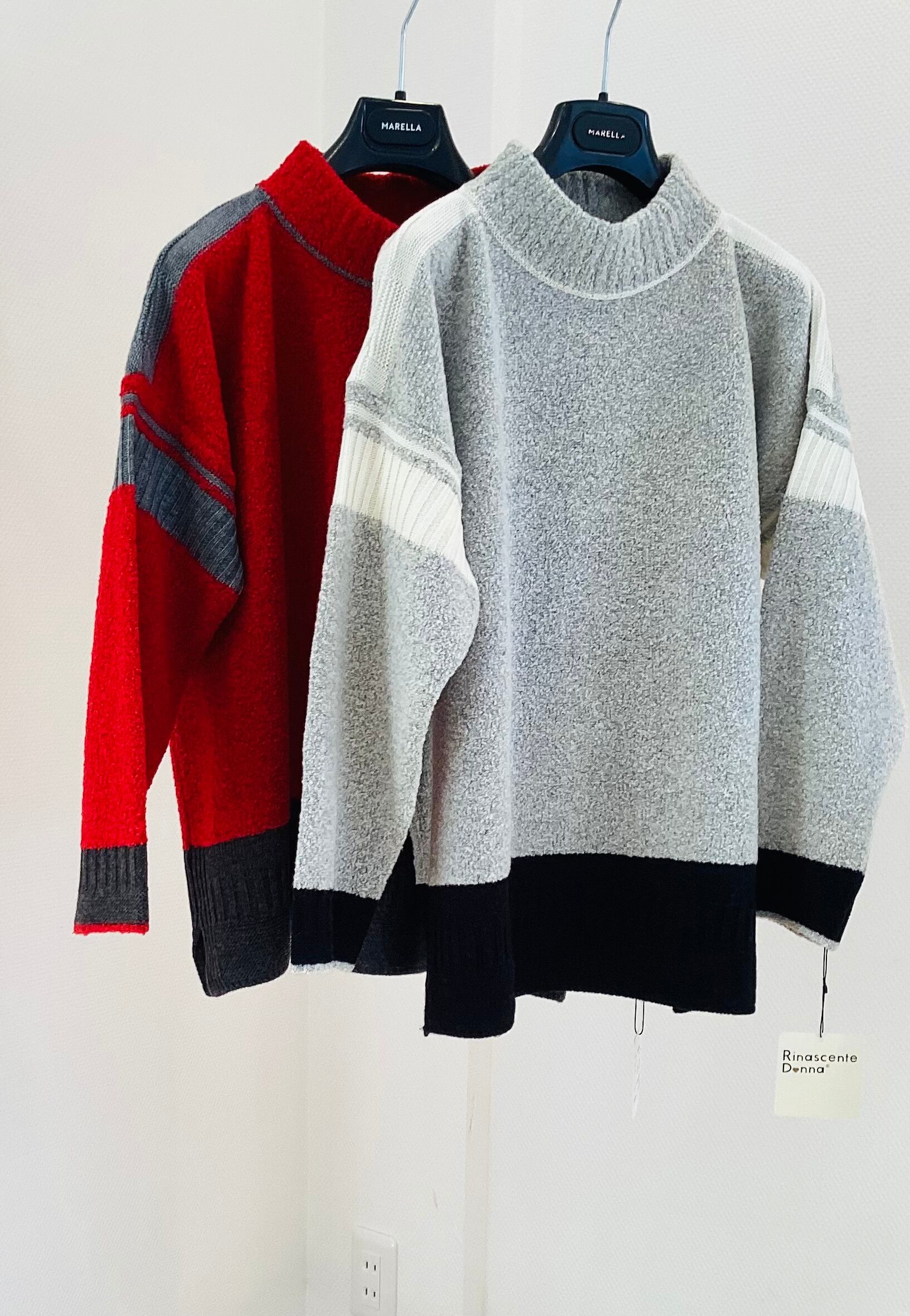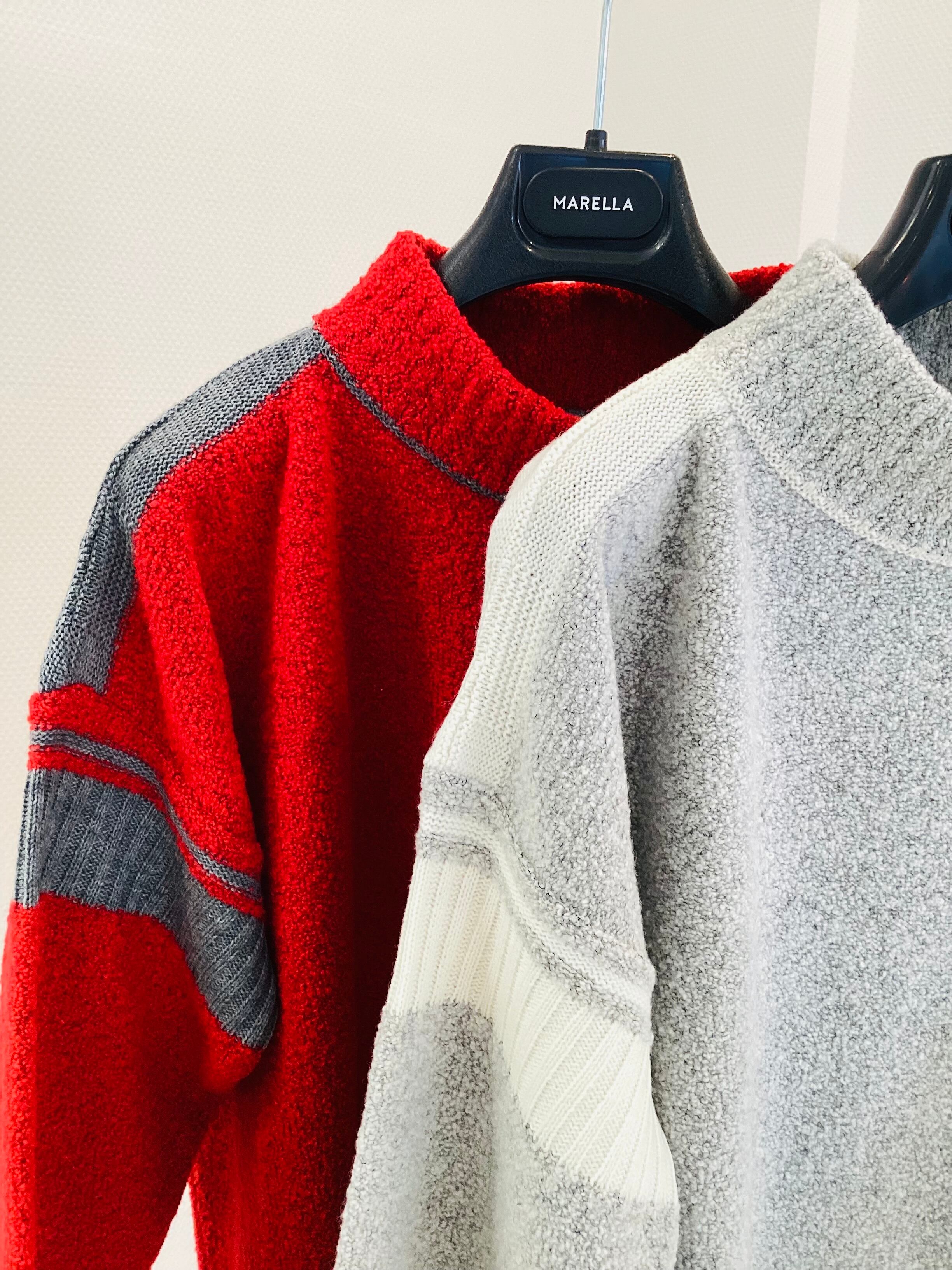 肩の切り替えや裾、袖口に配色を効かせることで、一枚で洗練された印象を与えます。