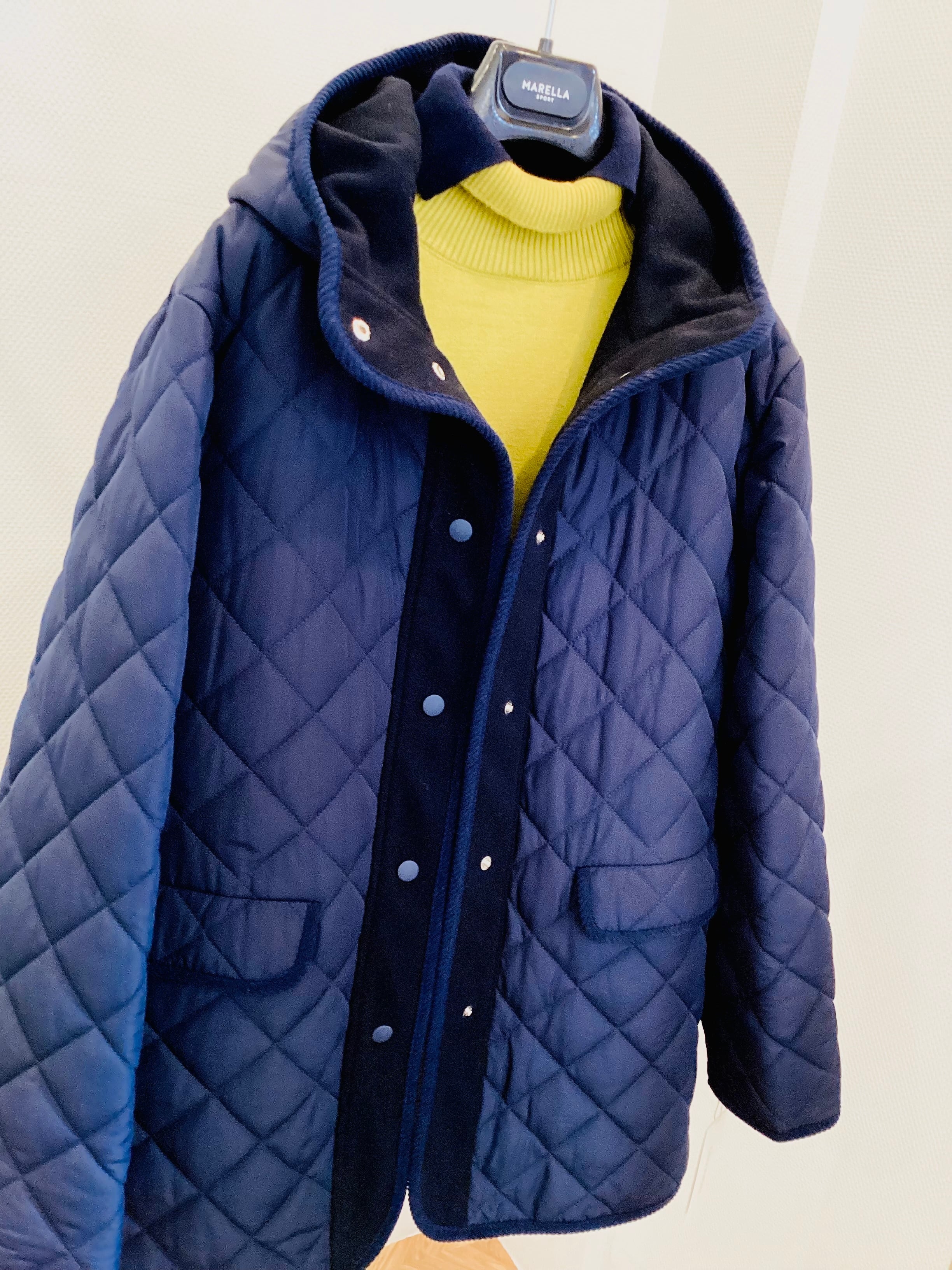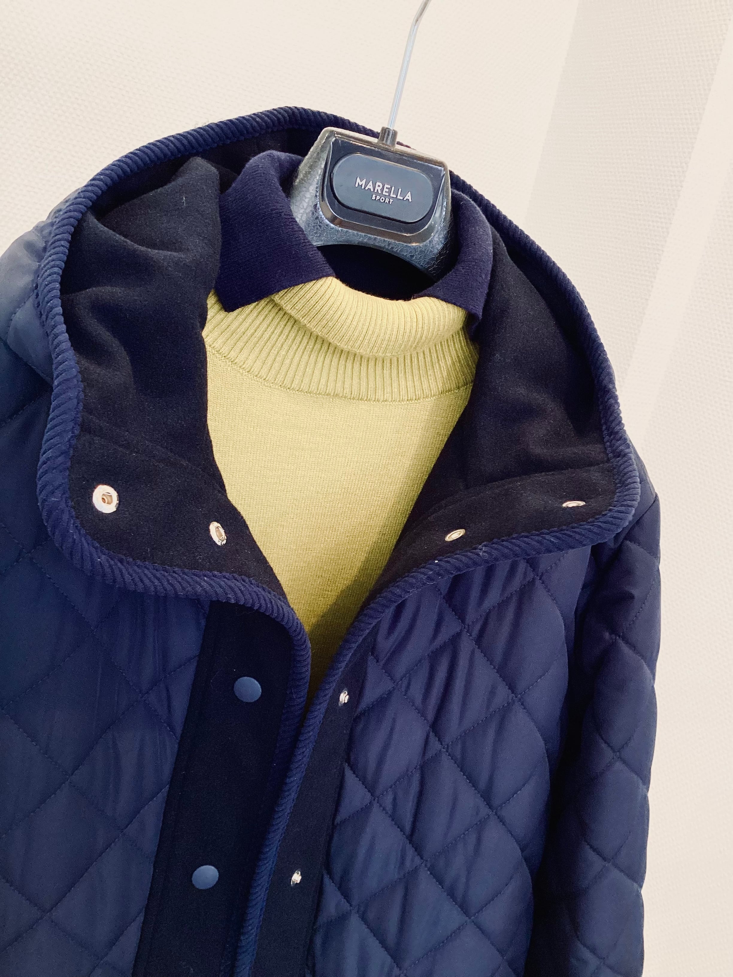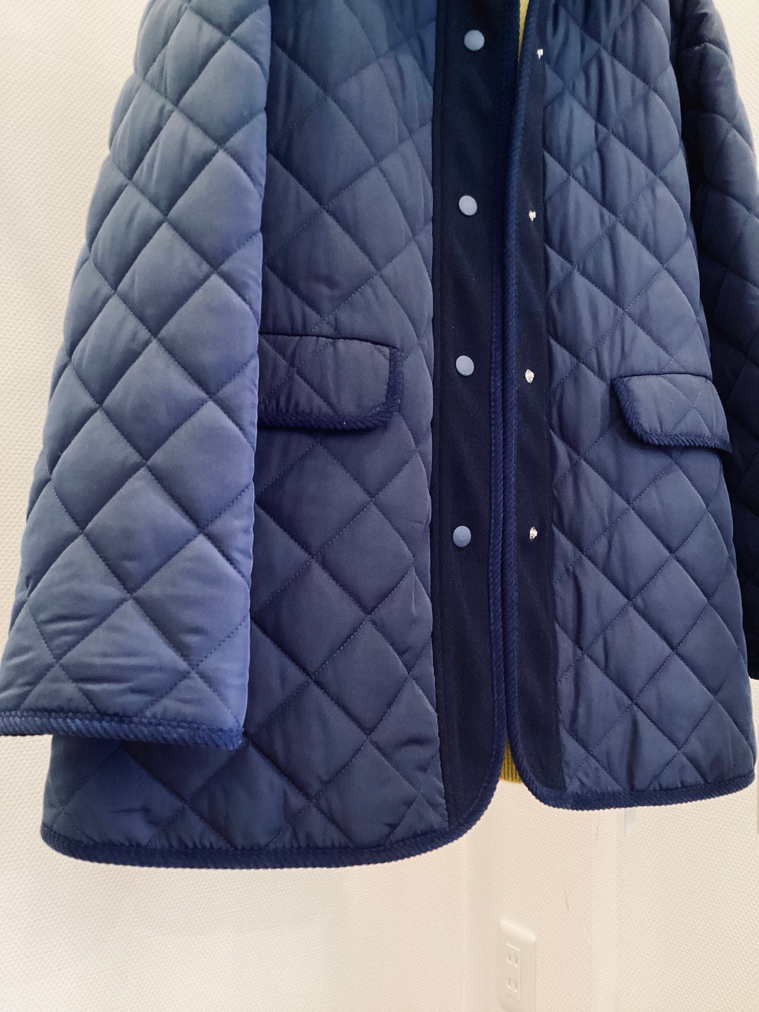 洗練された同色のトリミング使いが、カジュアルなキルティングコートに