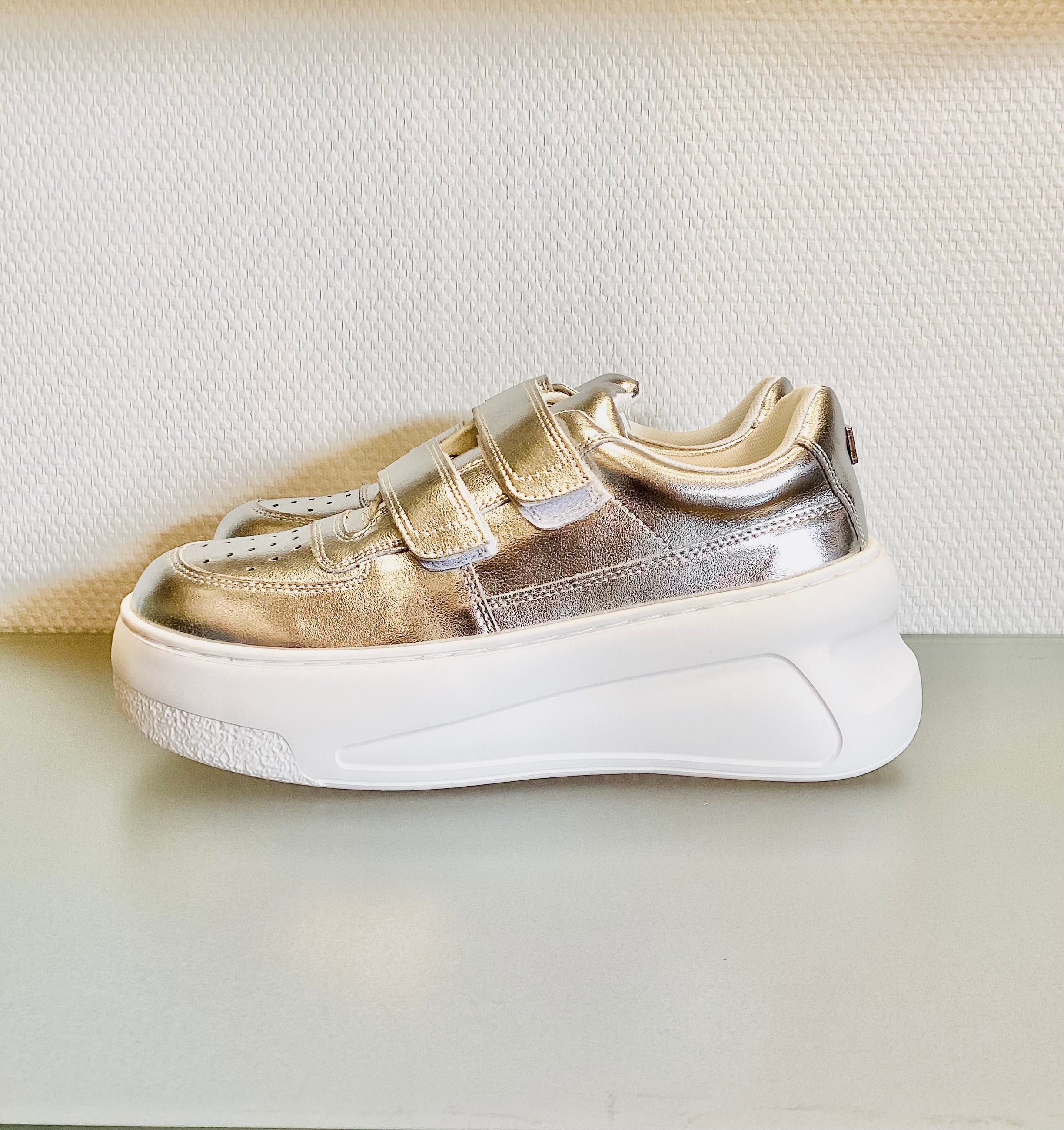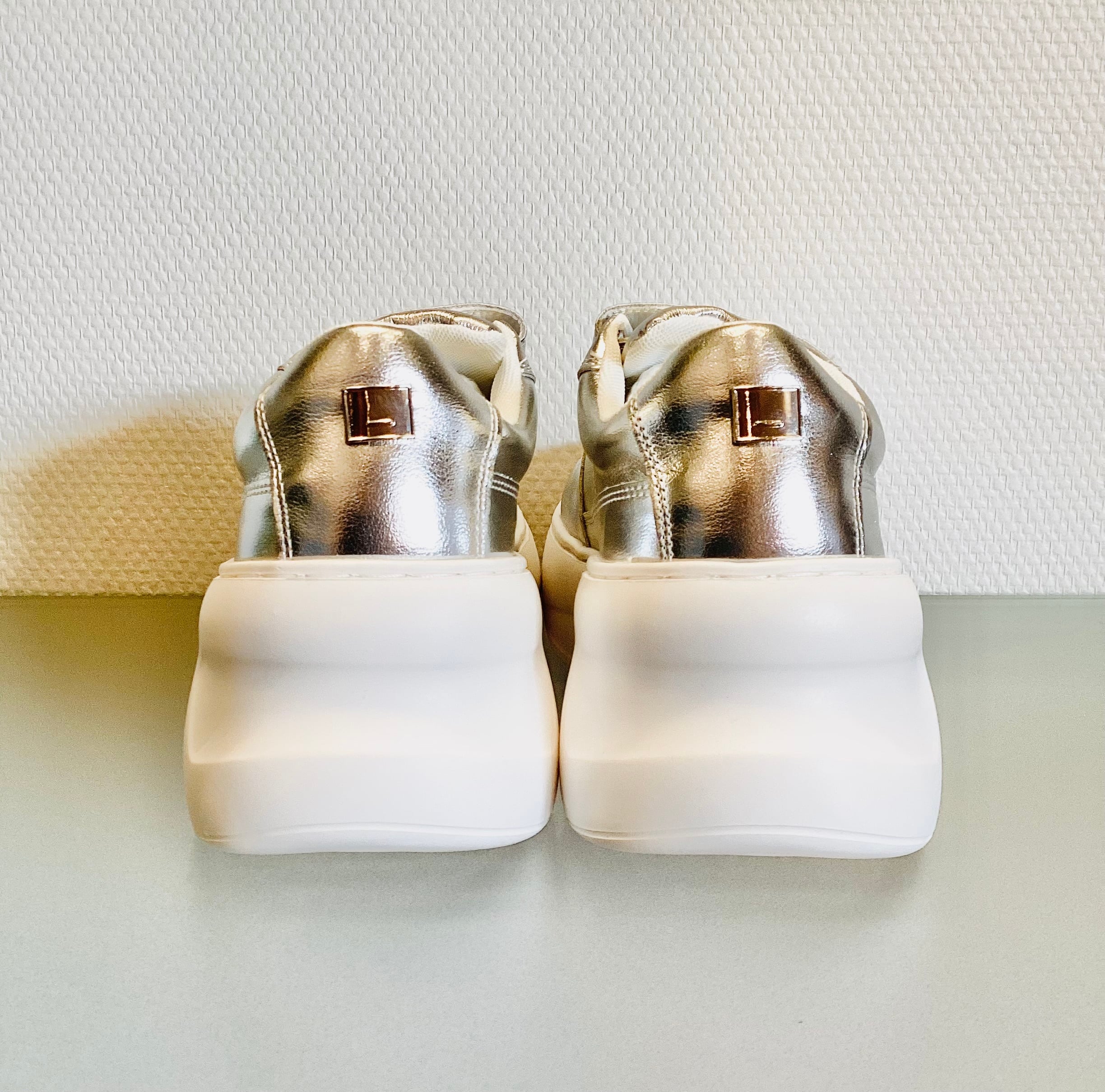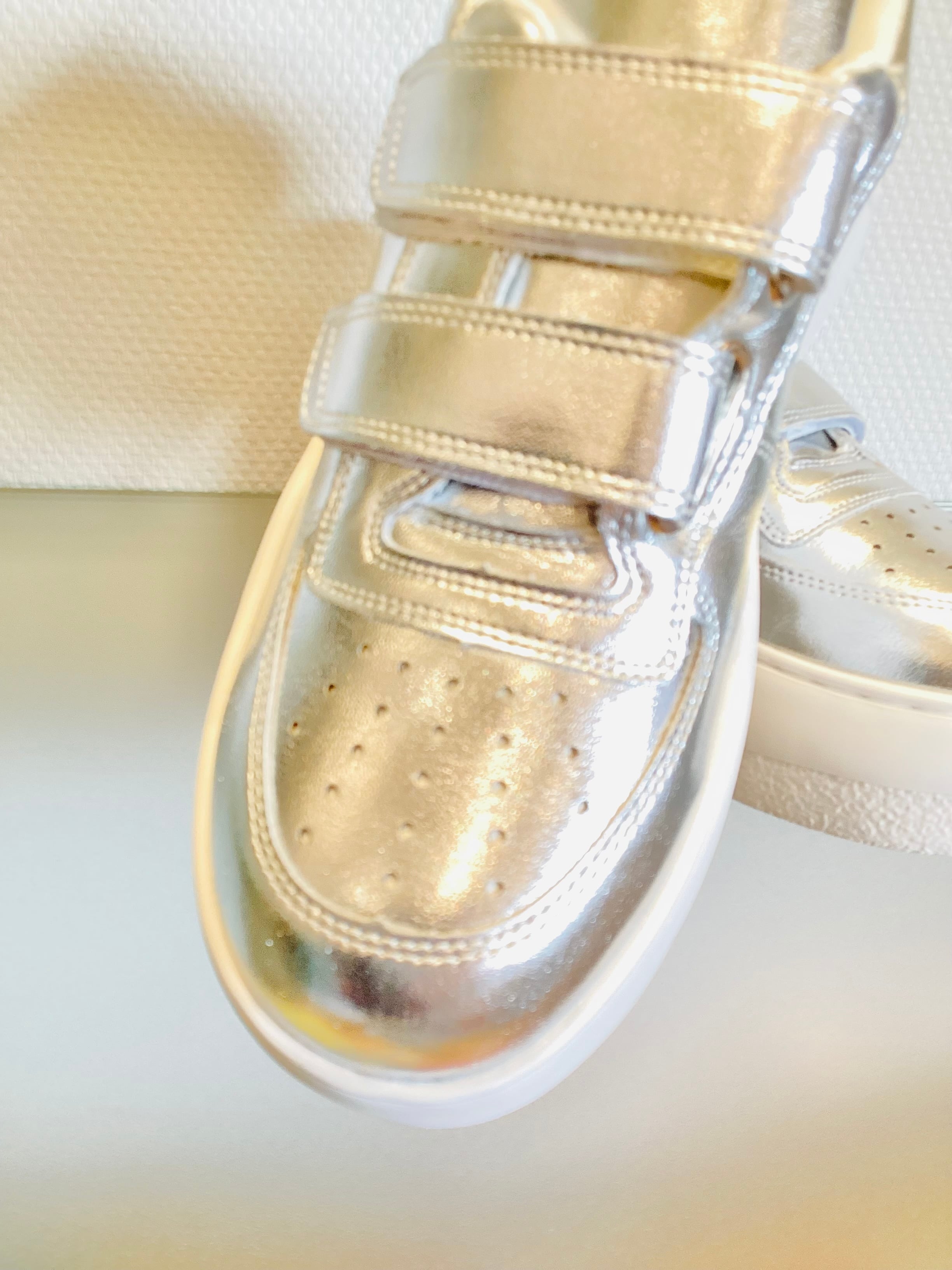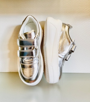 程よい光沢感が魅力の、シルバーの厚底スニーカー。