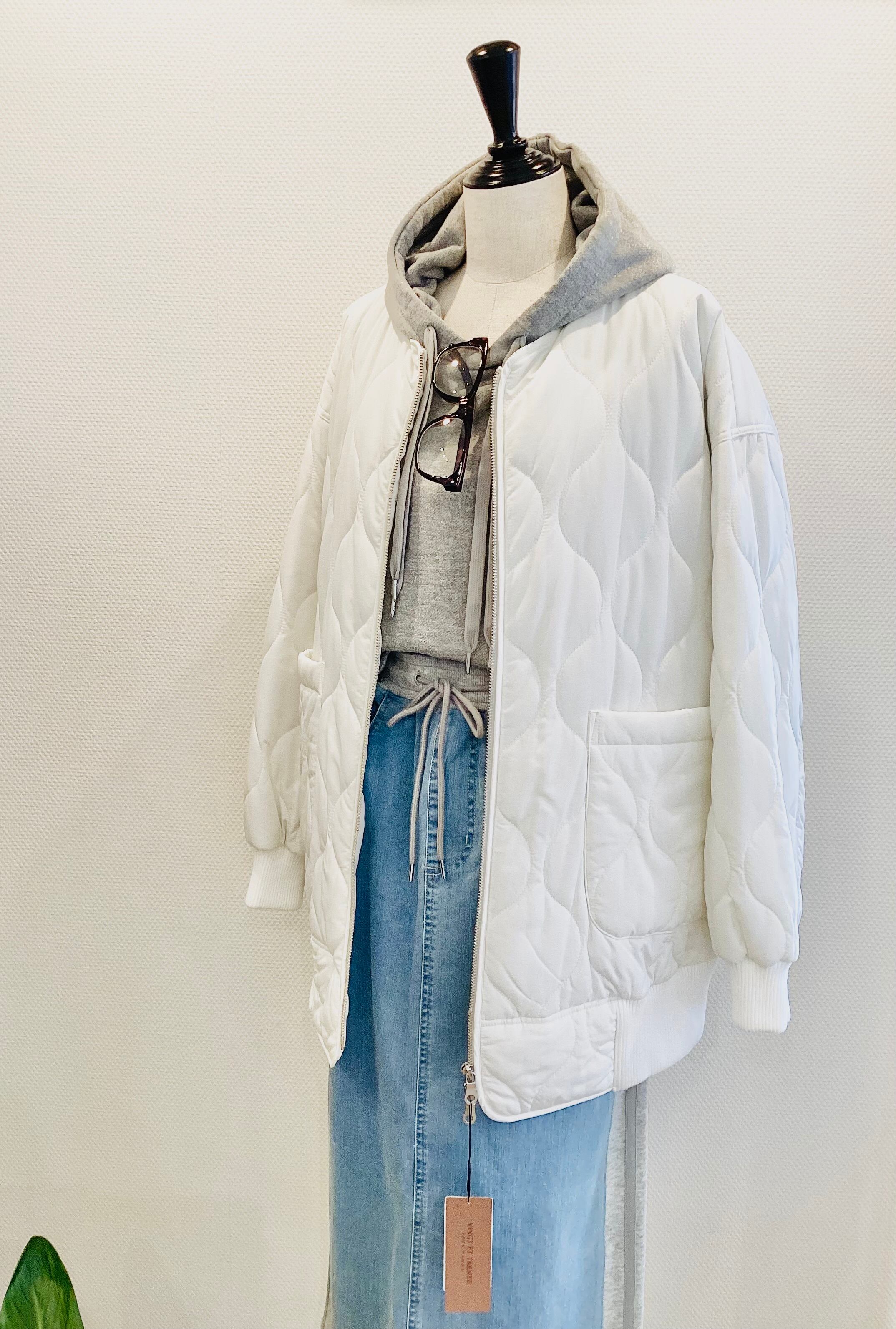 冬から春へのバトンタッチに最適な**「裾ワイドリブ・キルティングミドル丈コート」**