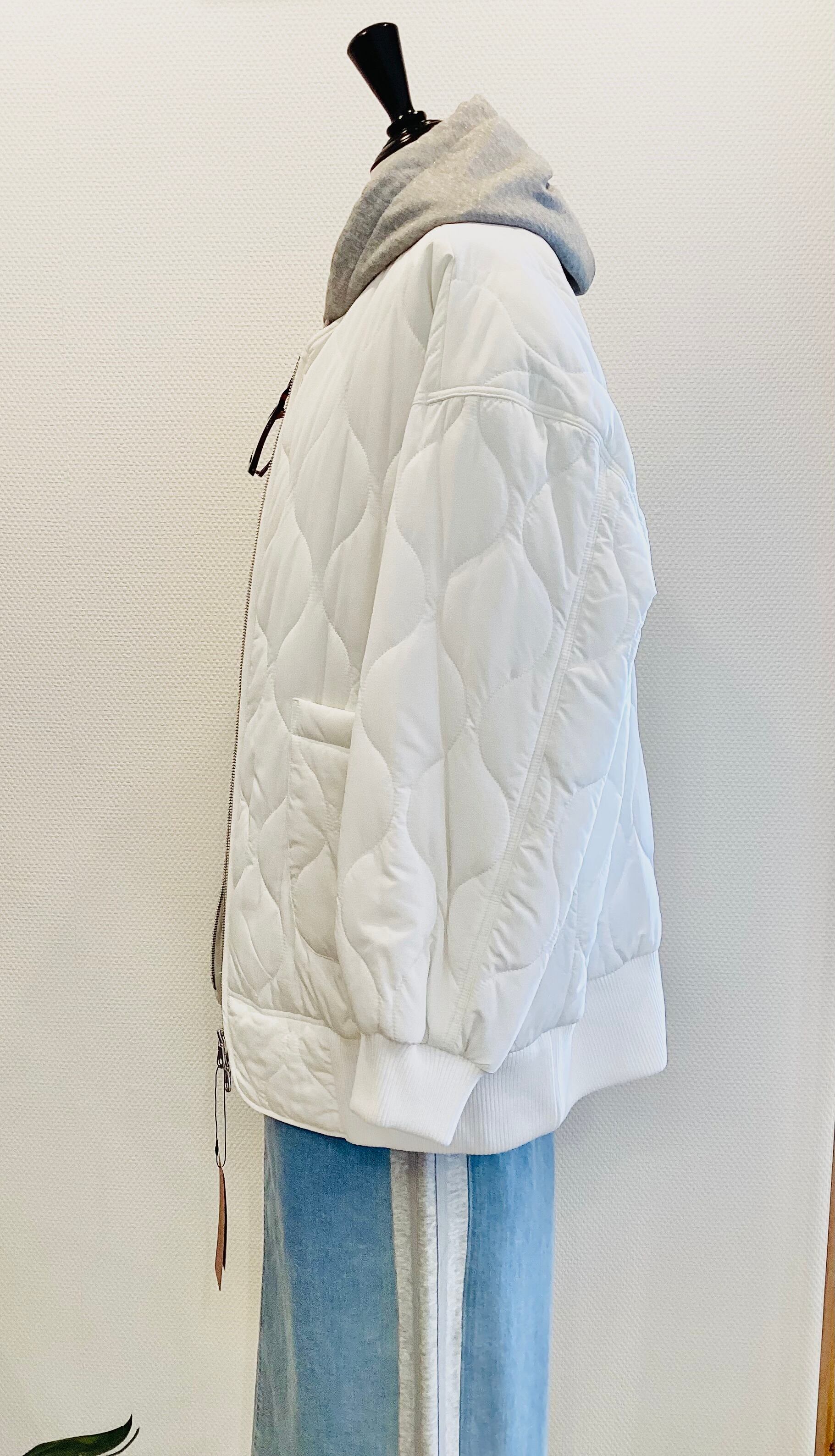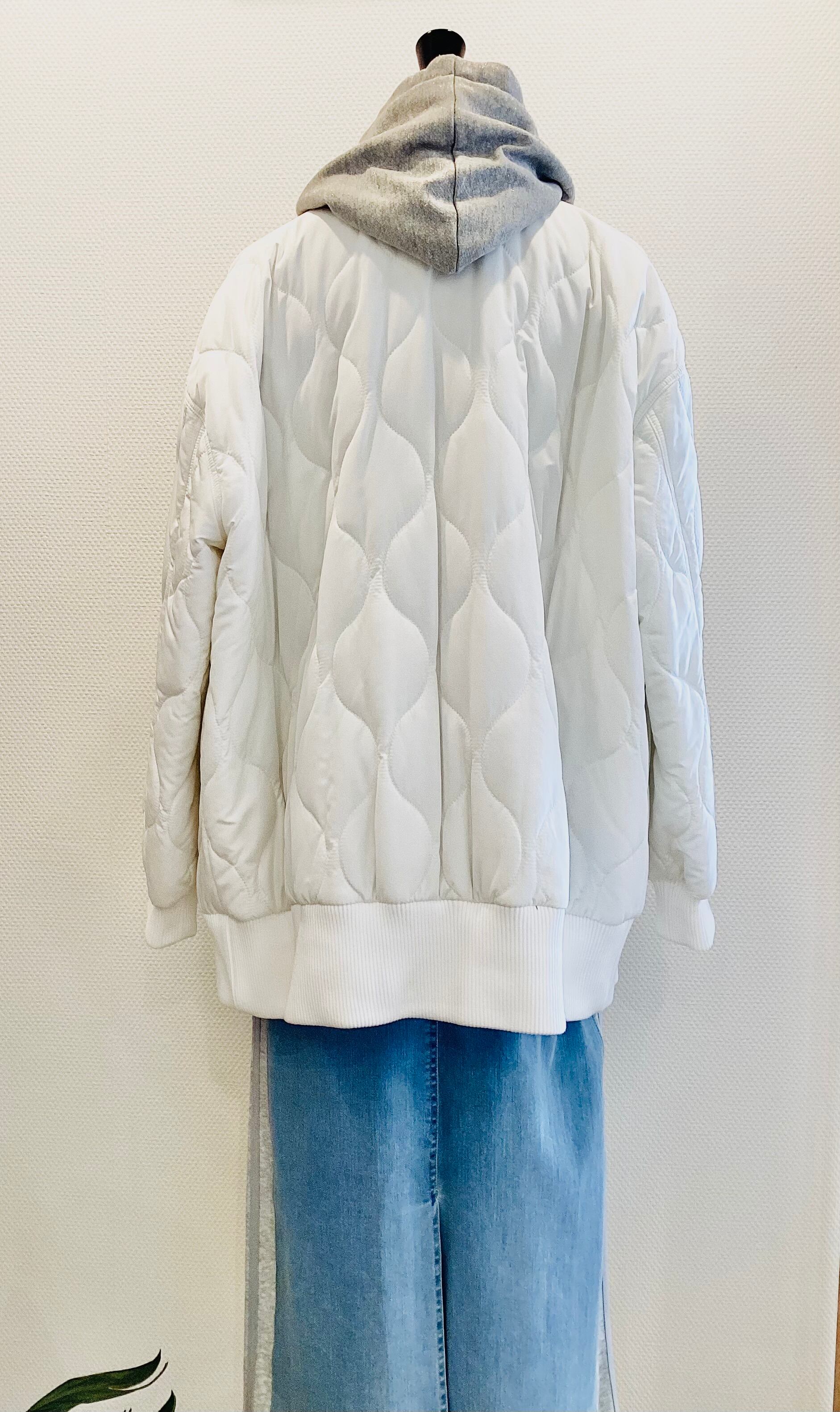 定番のキルティングコートを、裾の幅広なリブ使いでキュッと引き締め