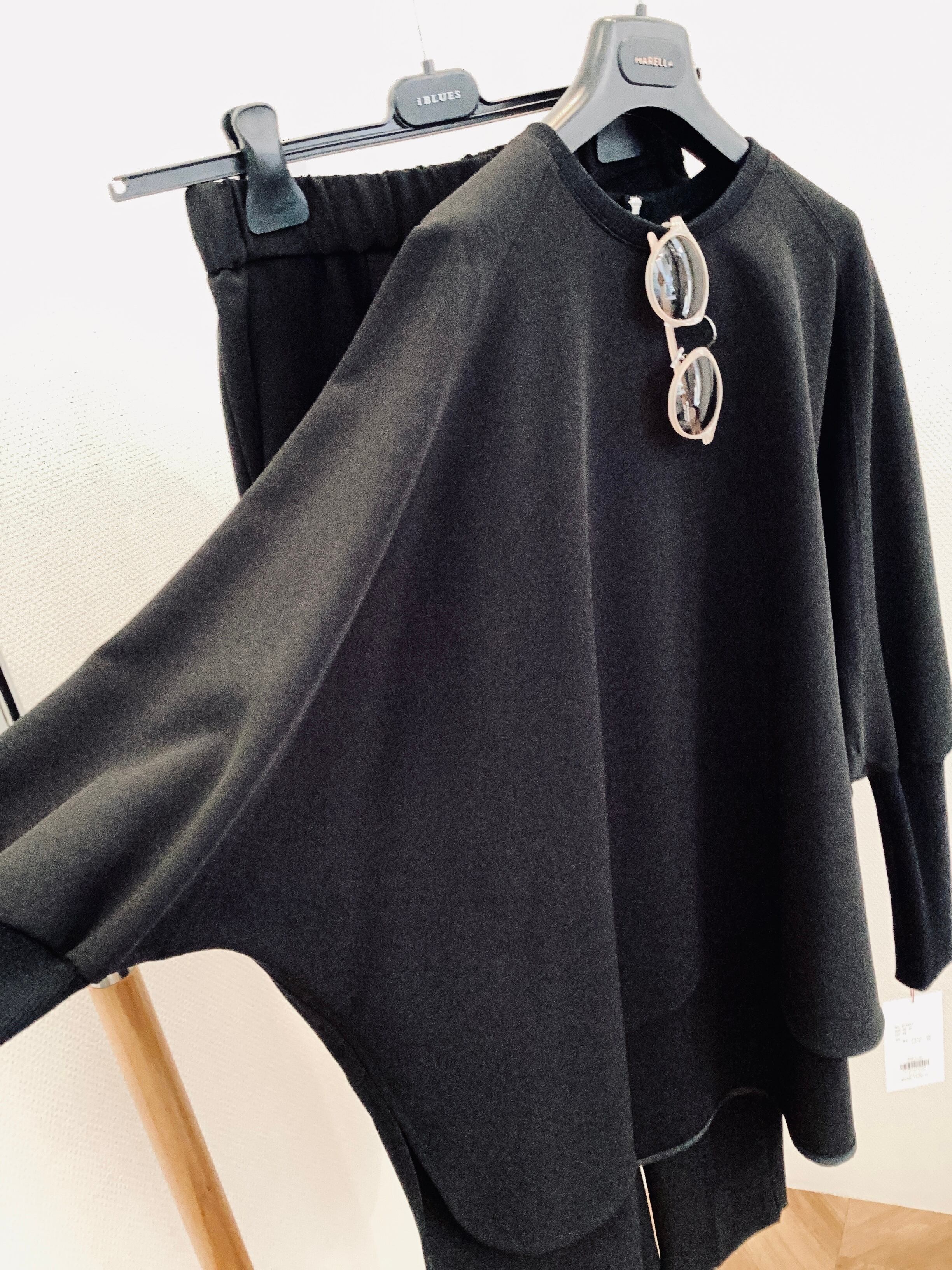 ドルマンスリーブが描く「大人のゆとり」 肩のラインを拾わないドルマンスリーブ。 二の腕周りを優しくカバーしつつ、ポリジョーゼットの落ち感が 「華奢なシルエット」を演出します。 パンツにフロントインすれば、脚長効果も倍増。 更に、袖口のロングカウスも華奢見えのポイント♪ とものパンツ合わせで、洗練シンプルスタイル完成ですよ^_−☆ サイズ フリー ポリエステル 100%