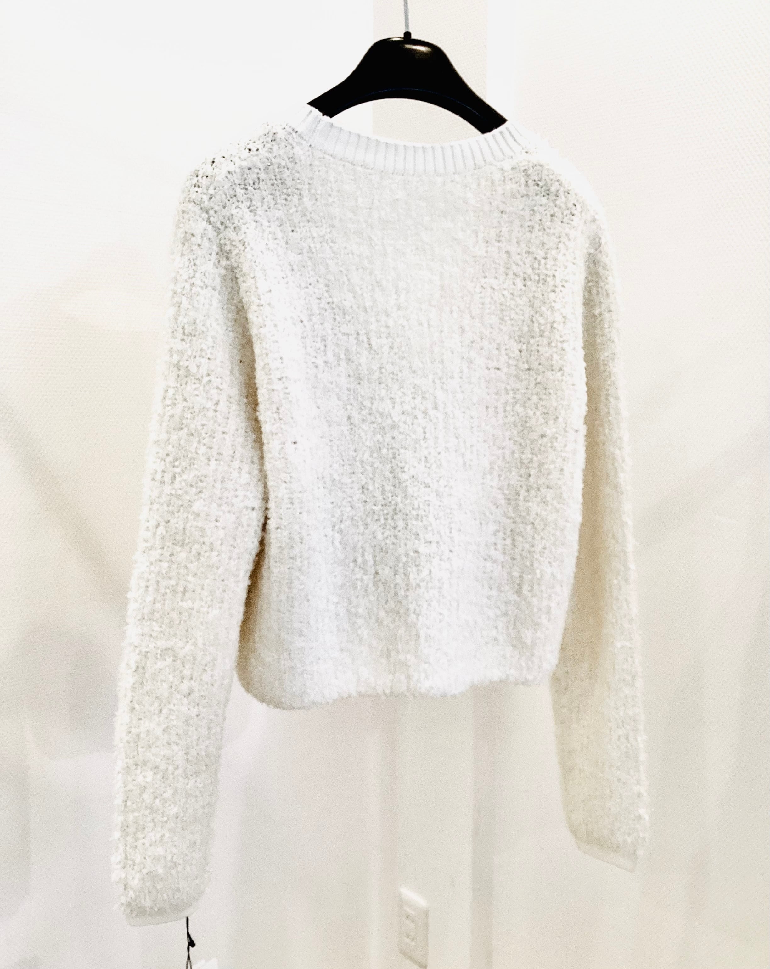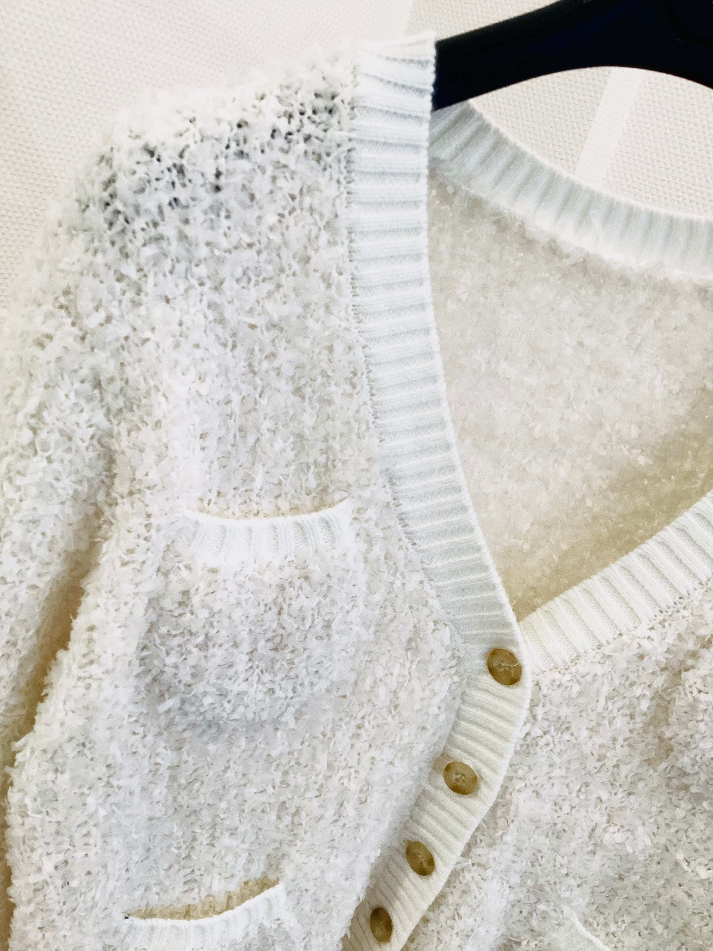 異なる質感の糸を複雑に編み込んだリボンヤーンを使用。