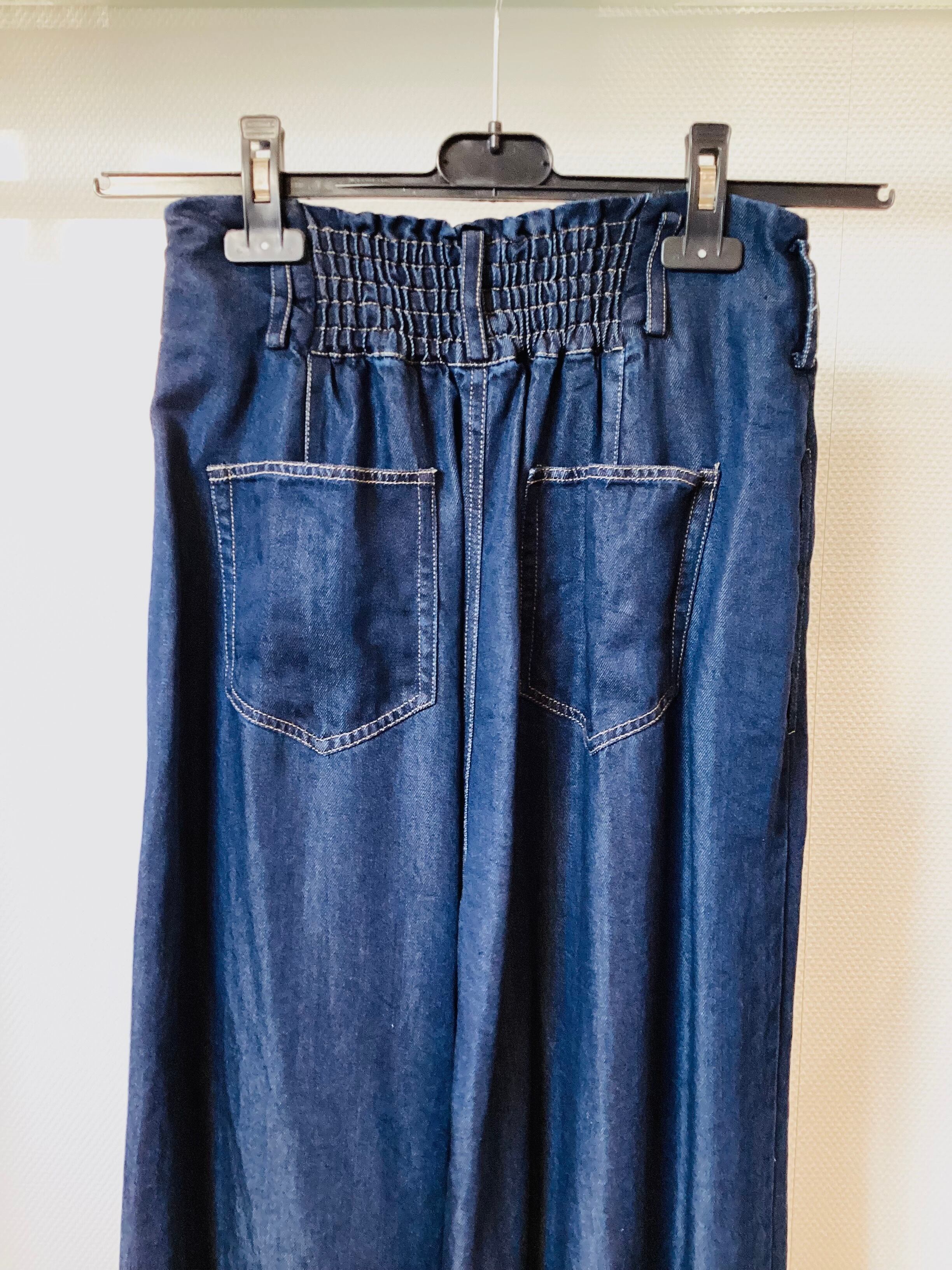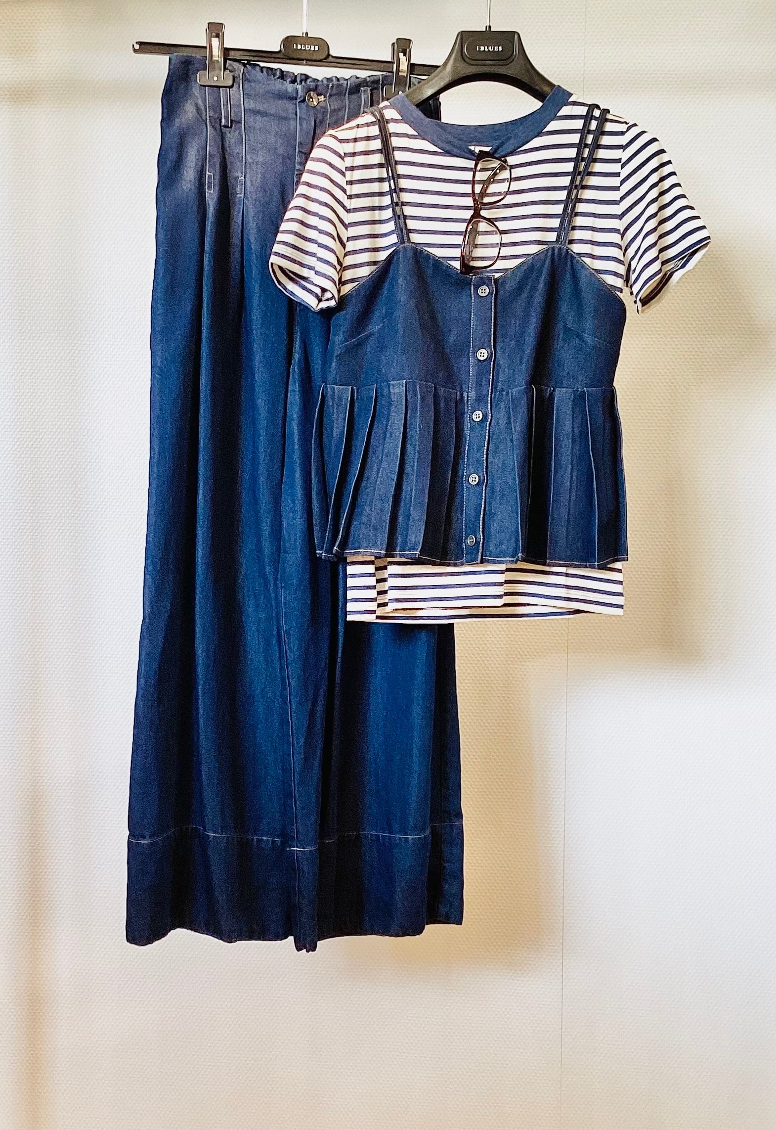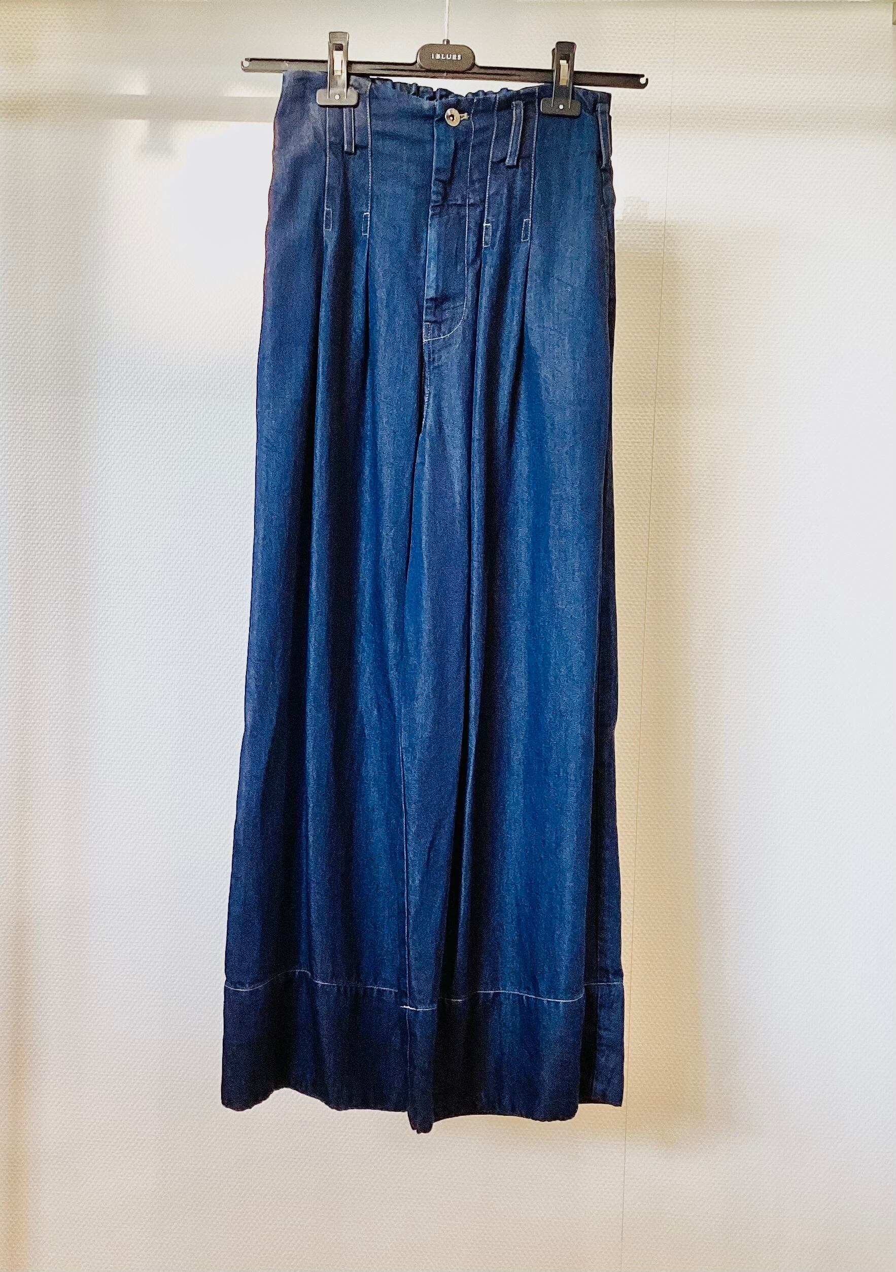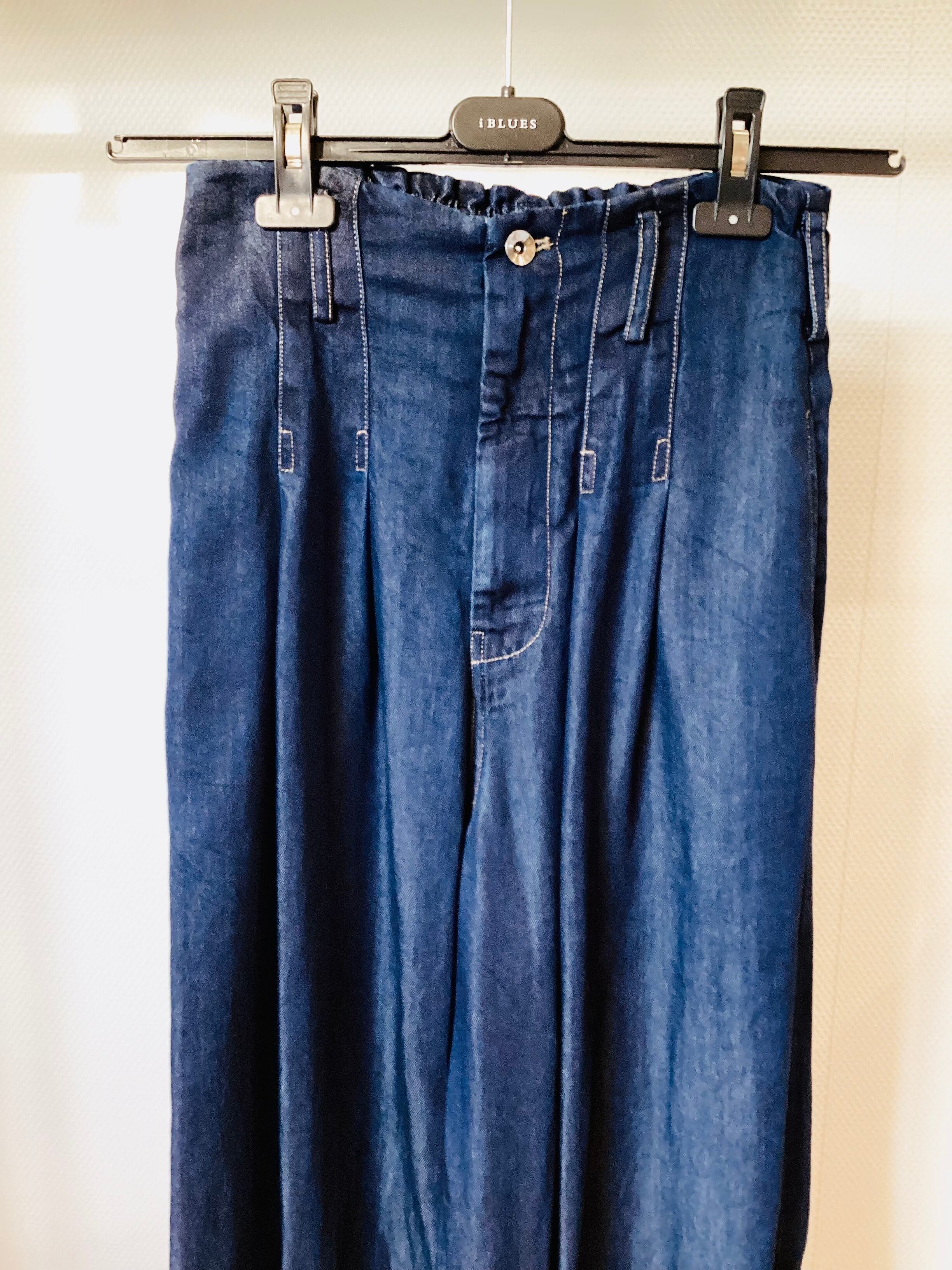 デニムの顔をして、シルクのようにしなやか。 ワイドシルエットでも横に広がらず、ストンと下に向かって流れるため 下半身をスッキリと長く見せる究極の着痩せ効果のパンツ♪ カジュアルなインディゴ染めに、落ち感が加わることで スニーカー合わせでもどこか気品が漂う「大人の余裕」を演出します。 とものキャミベストと合わせるとドレスパンツの様な一着に! カジュアルな中にも女らしさが漂う一押しパンツですよ^_−☆ サイズ S〜M(後ろゴム) 再生繊維(セルロース) 100%