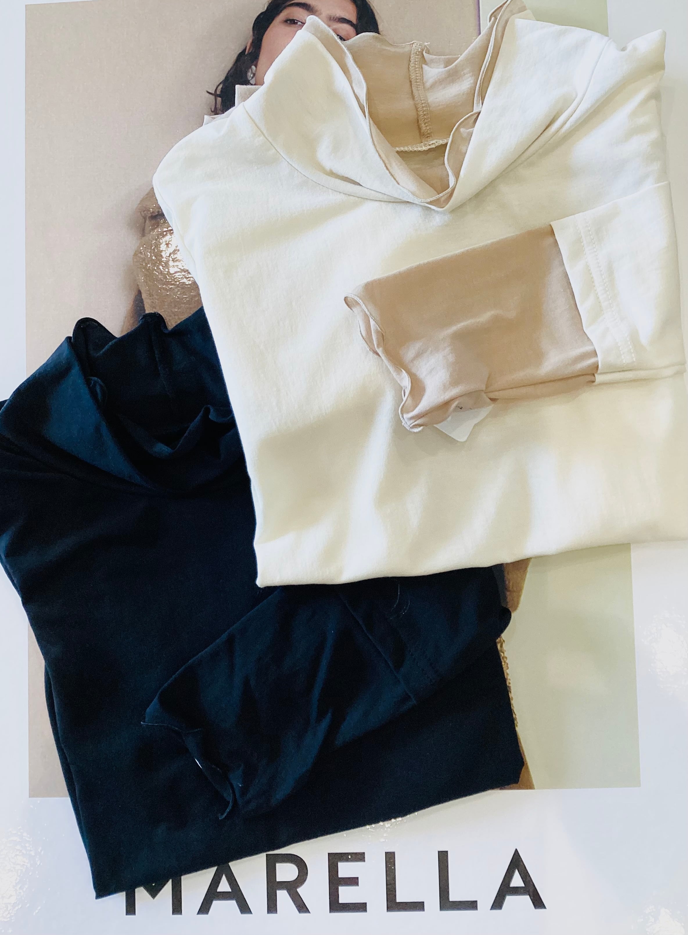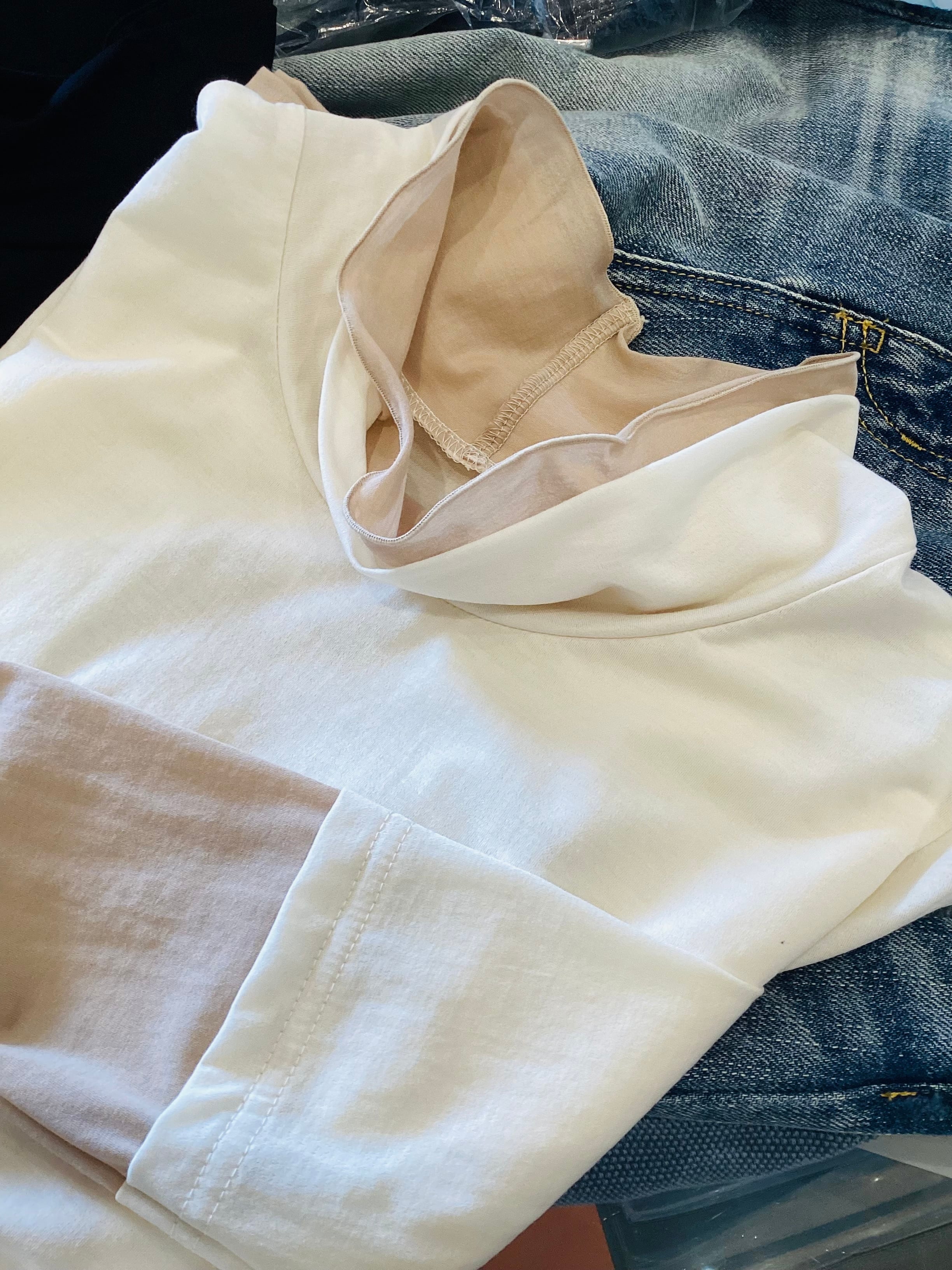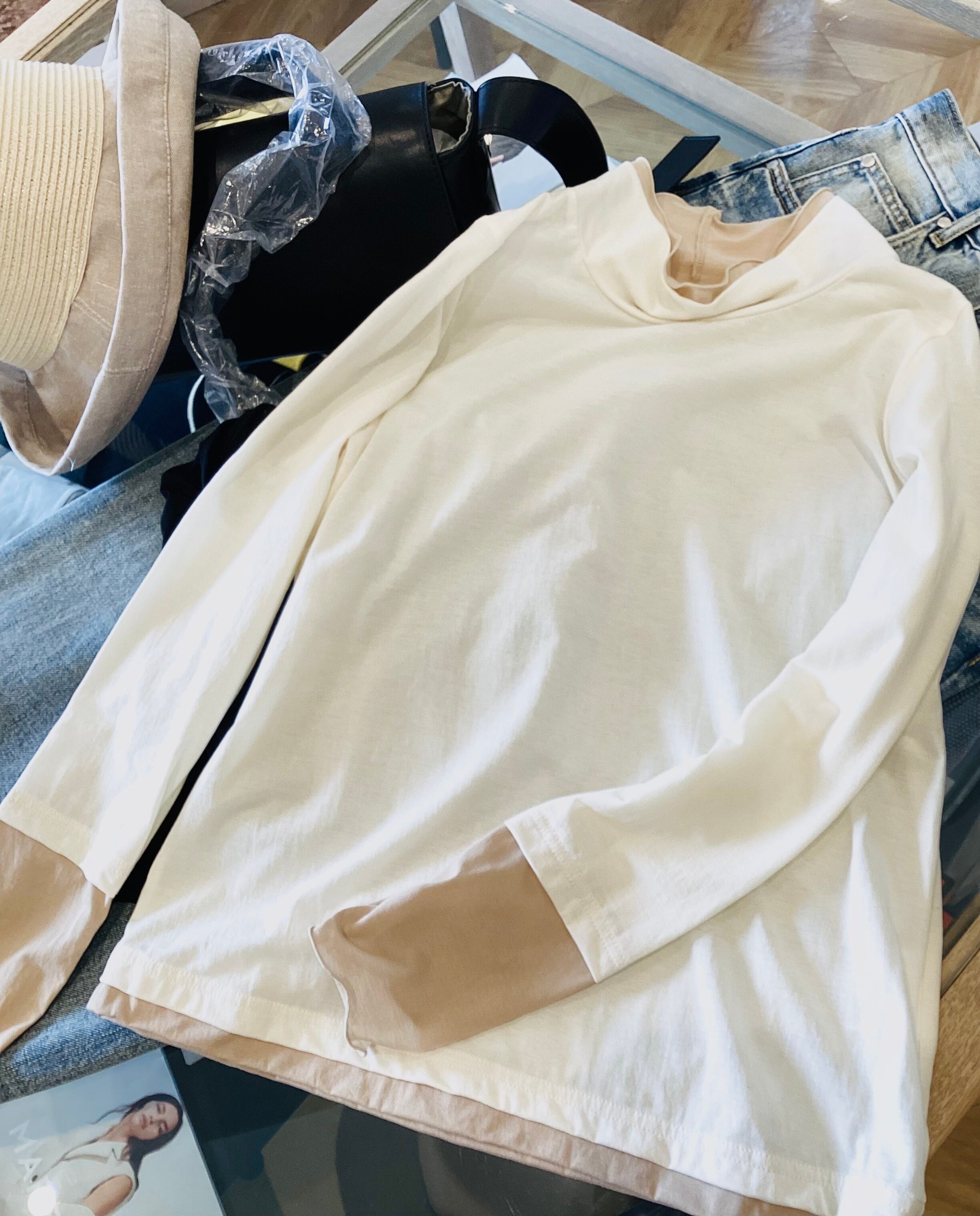 首元と袖口に、本体とは異なるカラーを配したレイヤード風デザイン。自分では難しい