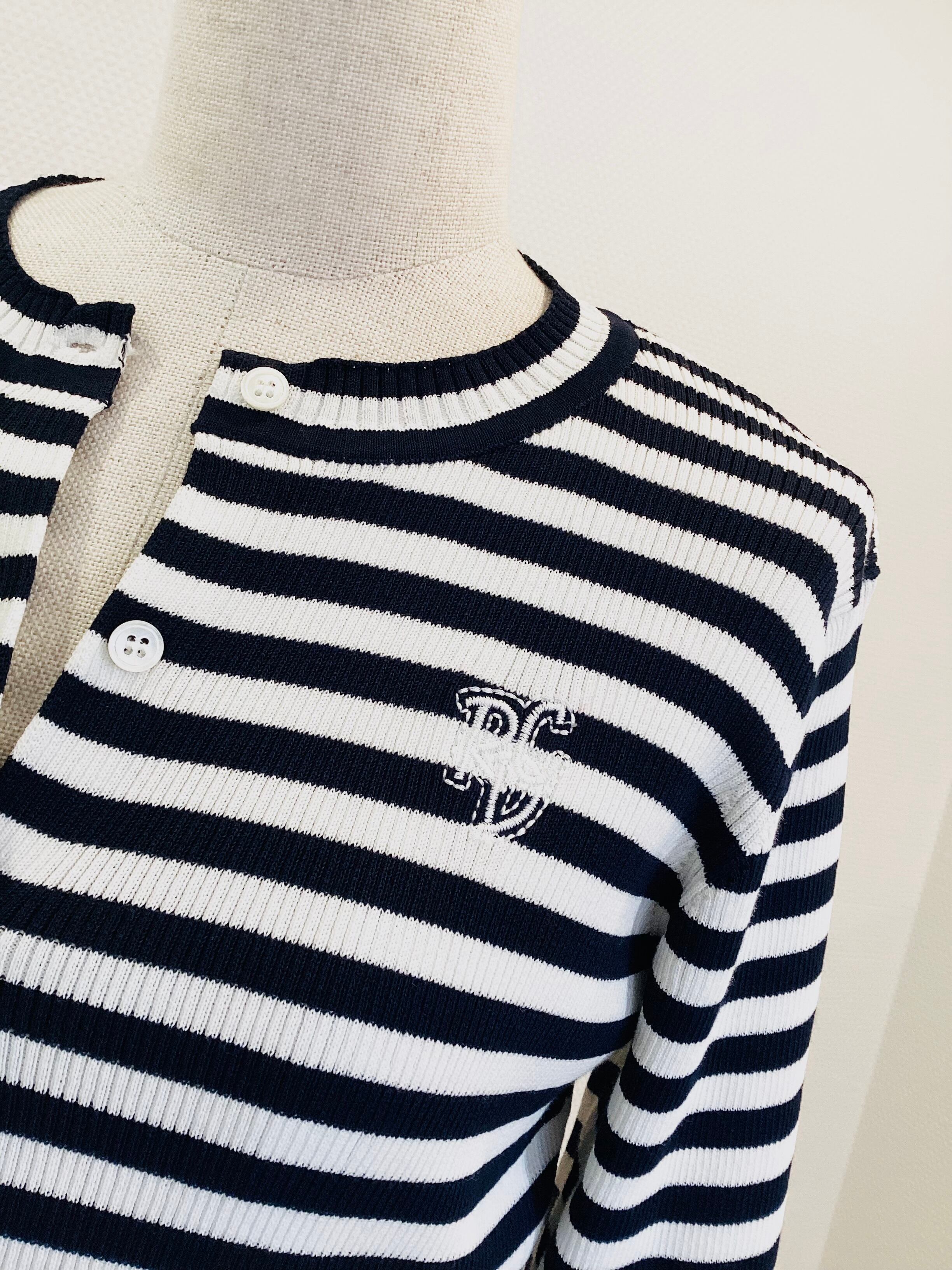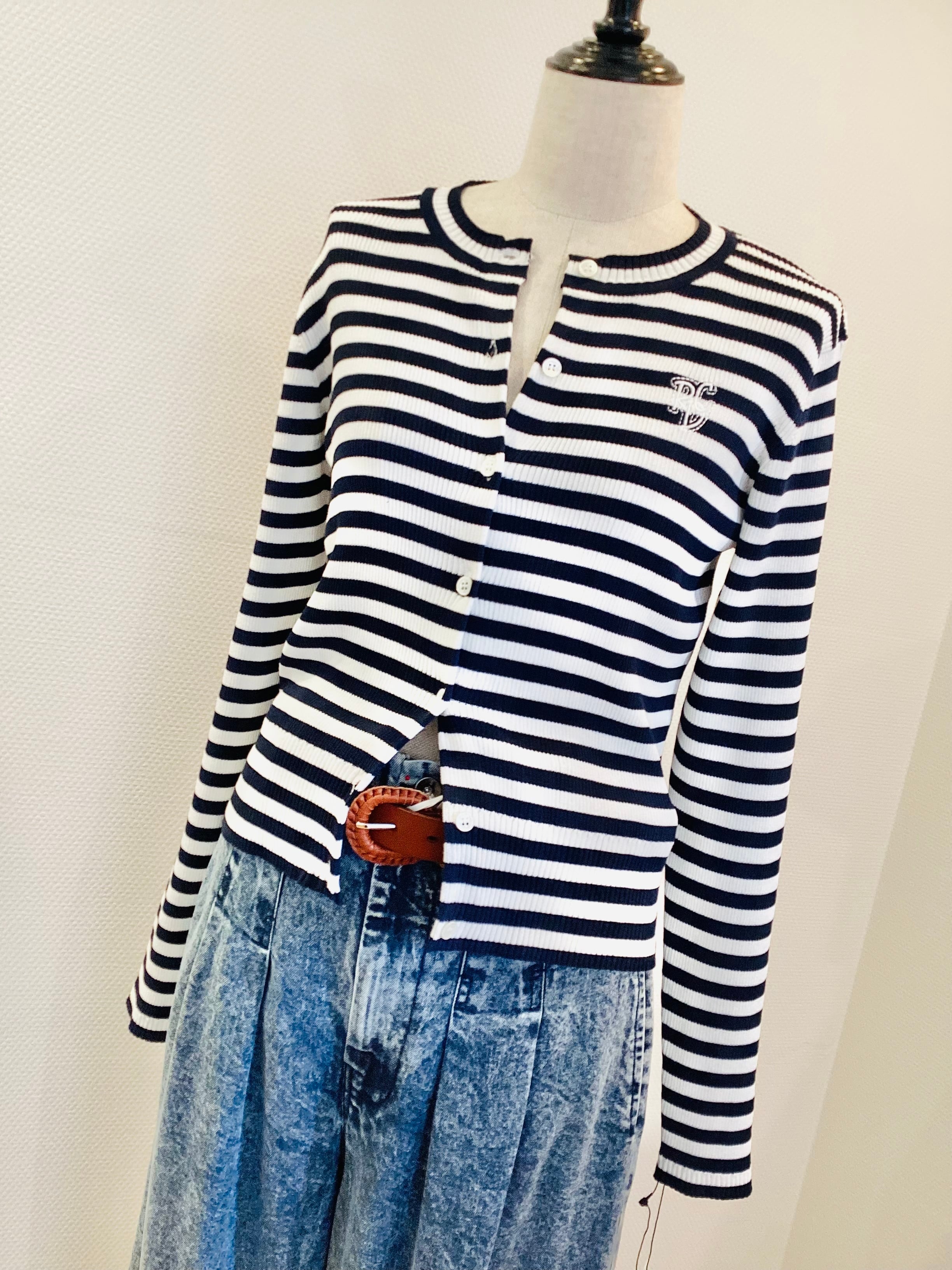 胸元に施された緻密なロゴ刺繍。 プリントにはない立体感と光沢が、シンプルなボーダーに クラス感をプラスします。 また、ネック、袖口、裾ラインとピッチに変化をつけた編み地のテクニックが シンプルながらも上質で洗練された雰囲気を醸しだし 今季注目の「育ちの良さ」を感じさせるスタイリングが楽しめます。 これからの季節“ヘビロテ”したくなる 羽織って良し、肩掛けて良しの万能アイテムですよ^_−☆ サイズ M 綿 57% ポリエステル 43%