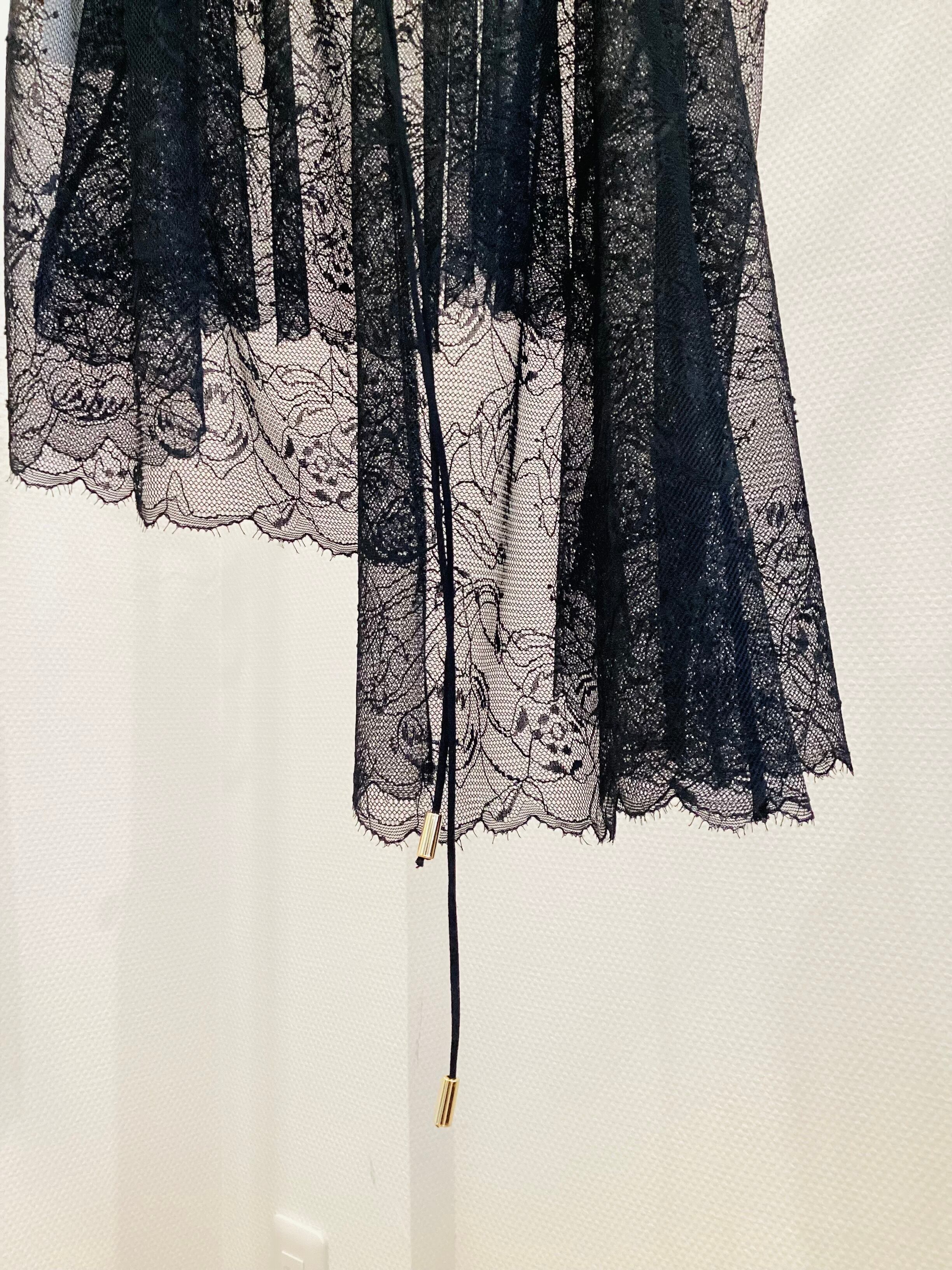 繊細なフラワーレースと、計算された大胆なアシメトリー(左右非対称)シルエットが