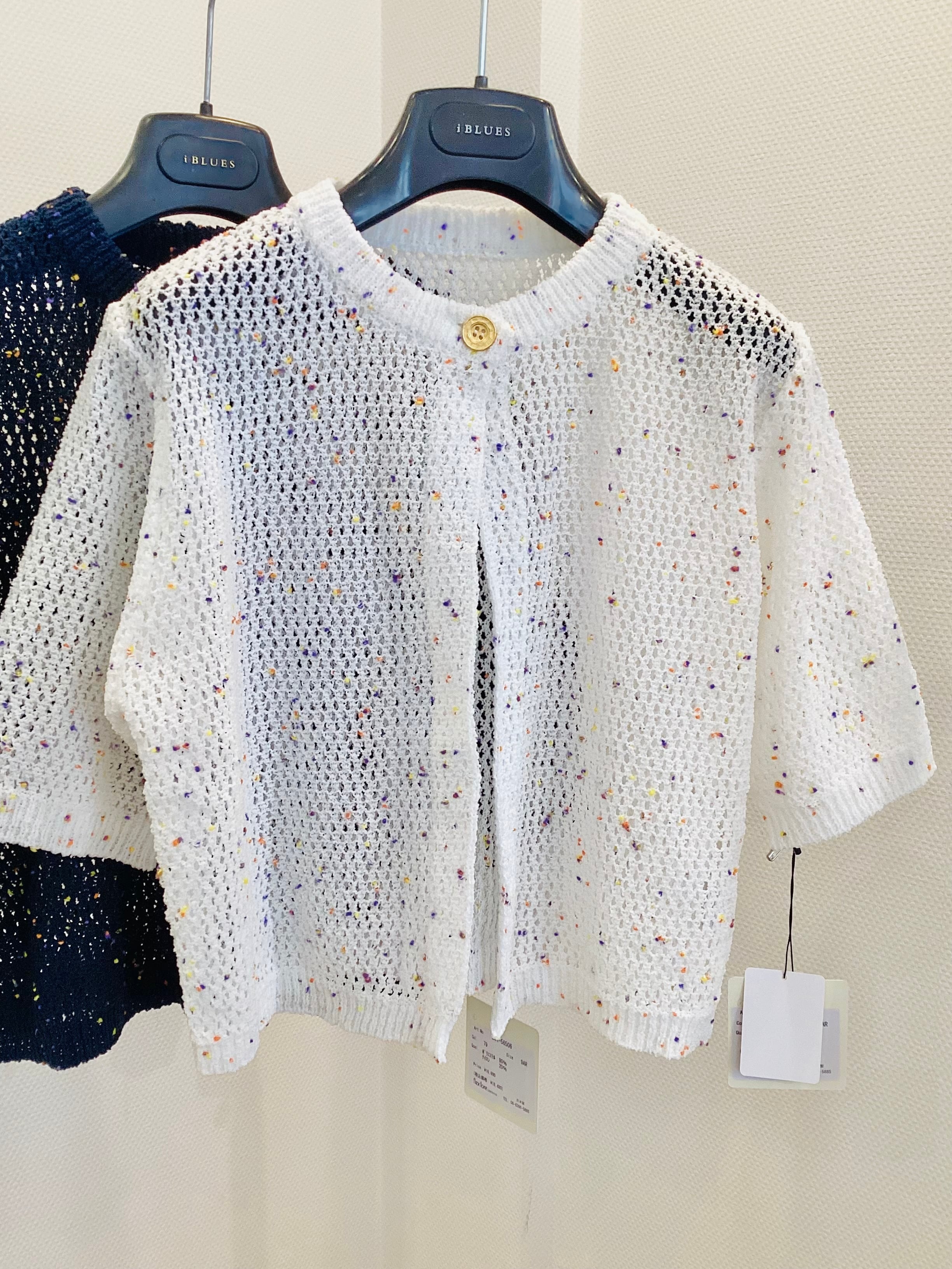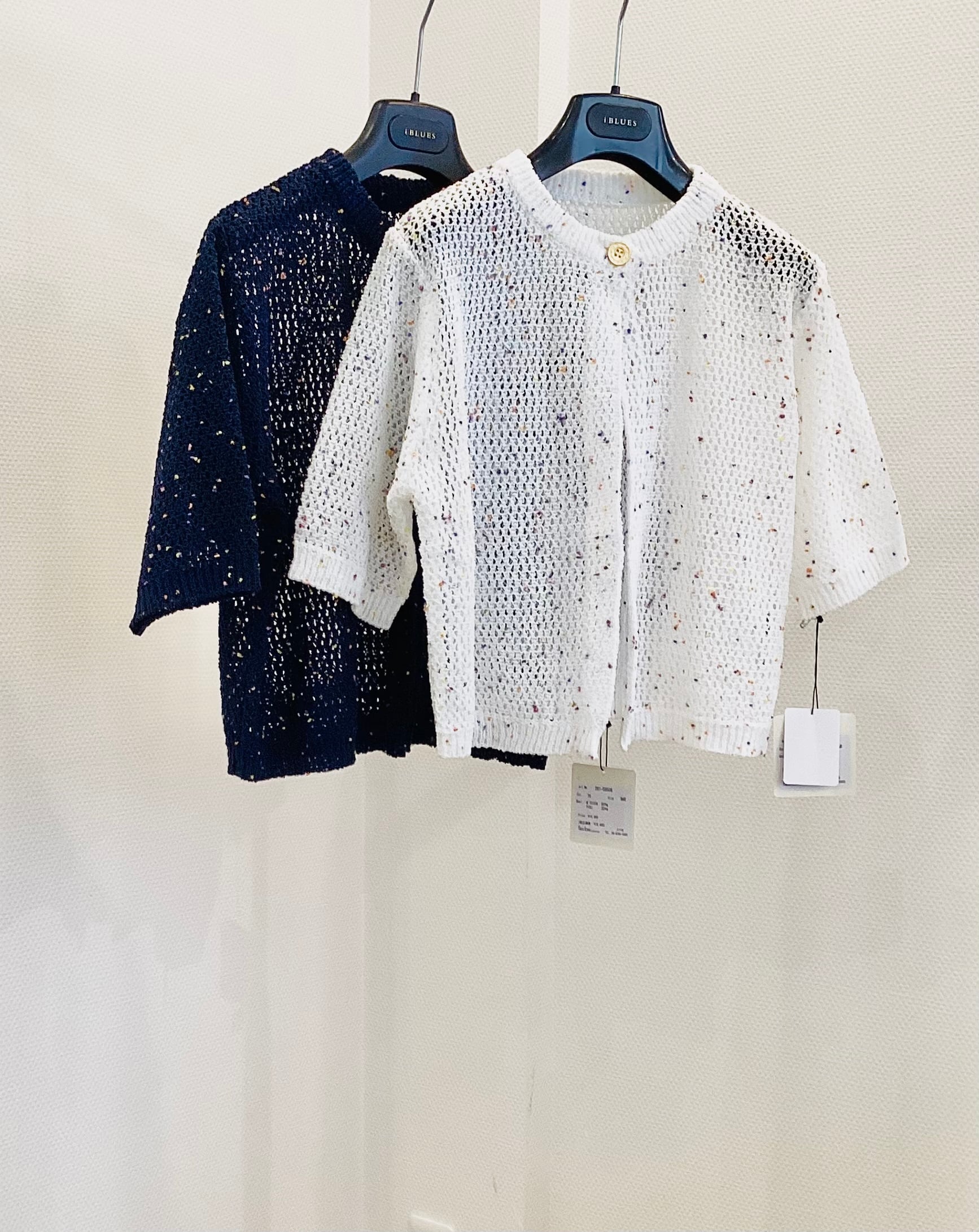 カラフルなネップ が表情を明るくするメッシュボレロです。 風を通すシアーなメッシュニットは夏の肌にサラッと涼しく 計算されたボレロ丈 は、Tシャツやワンピースの上にさらりと羽織るだけで 重心を上げてスタイルアップを叶えます。 二の腕を隠しつつ、抜け感のある夏の羽織り・冷房避けにぴったりな実力派。 トレンドのレイヤードスタイルにベストなバランスの使えるアイテムですよ^ ^ サイズ M ポリエステル 80% ナイロン 20%