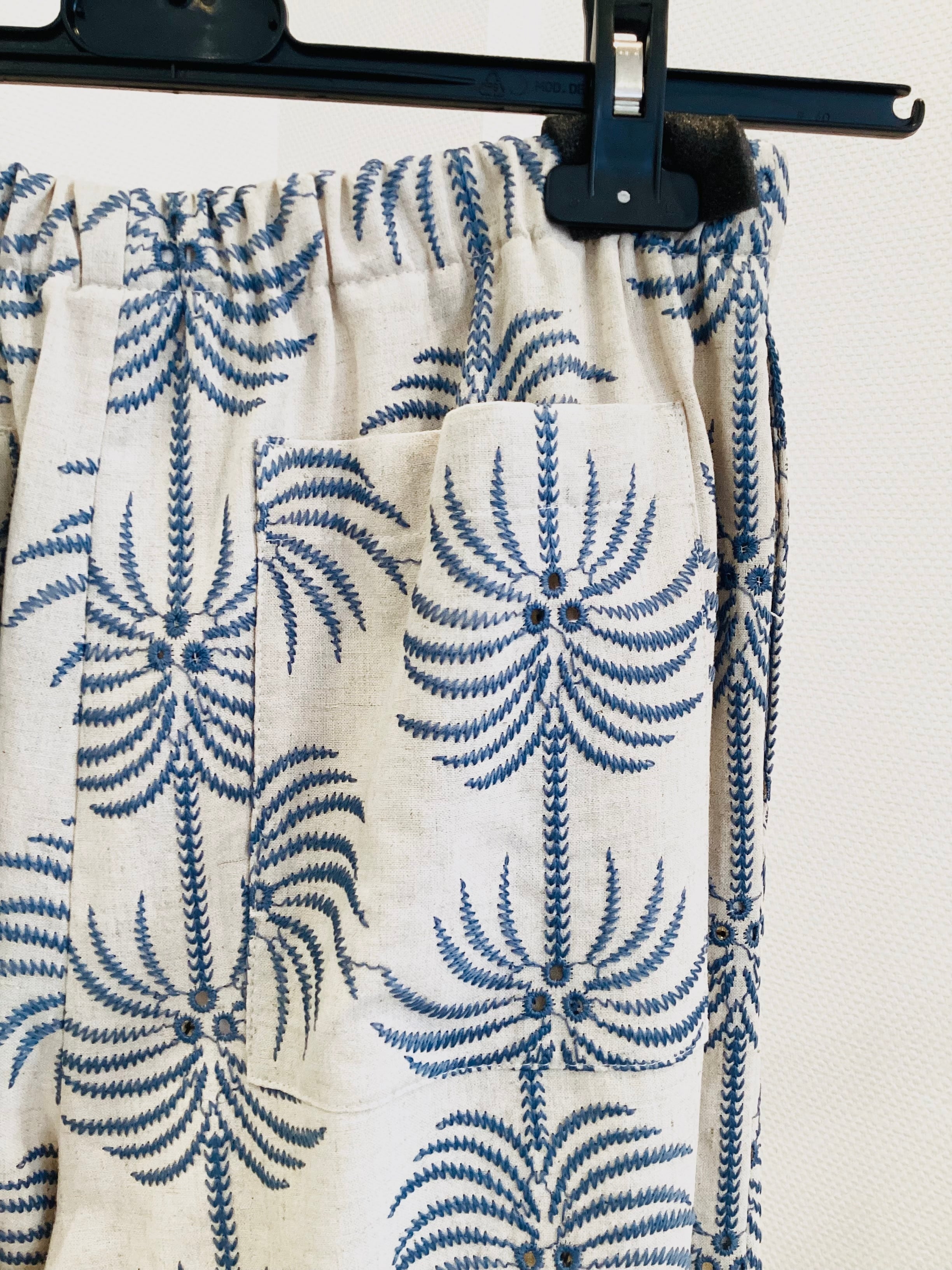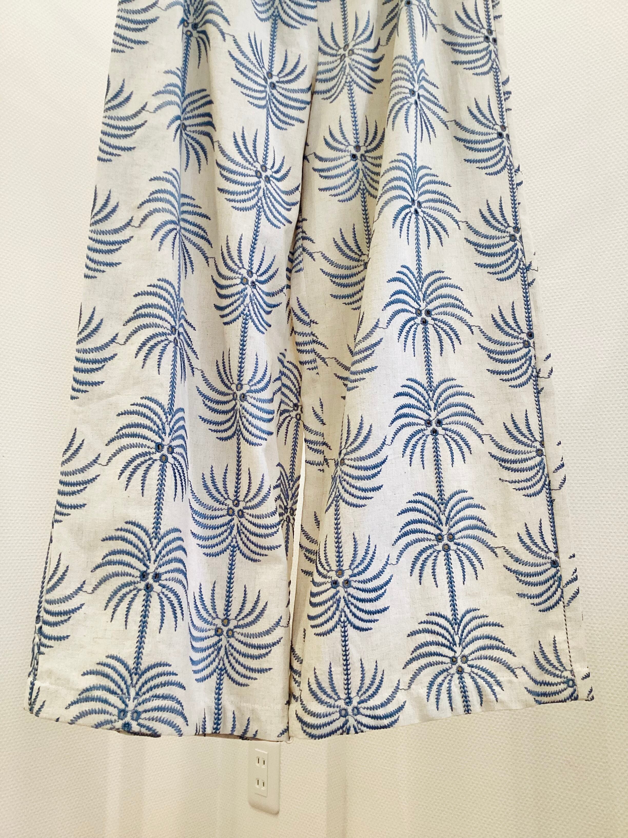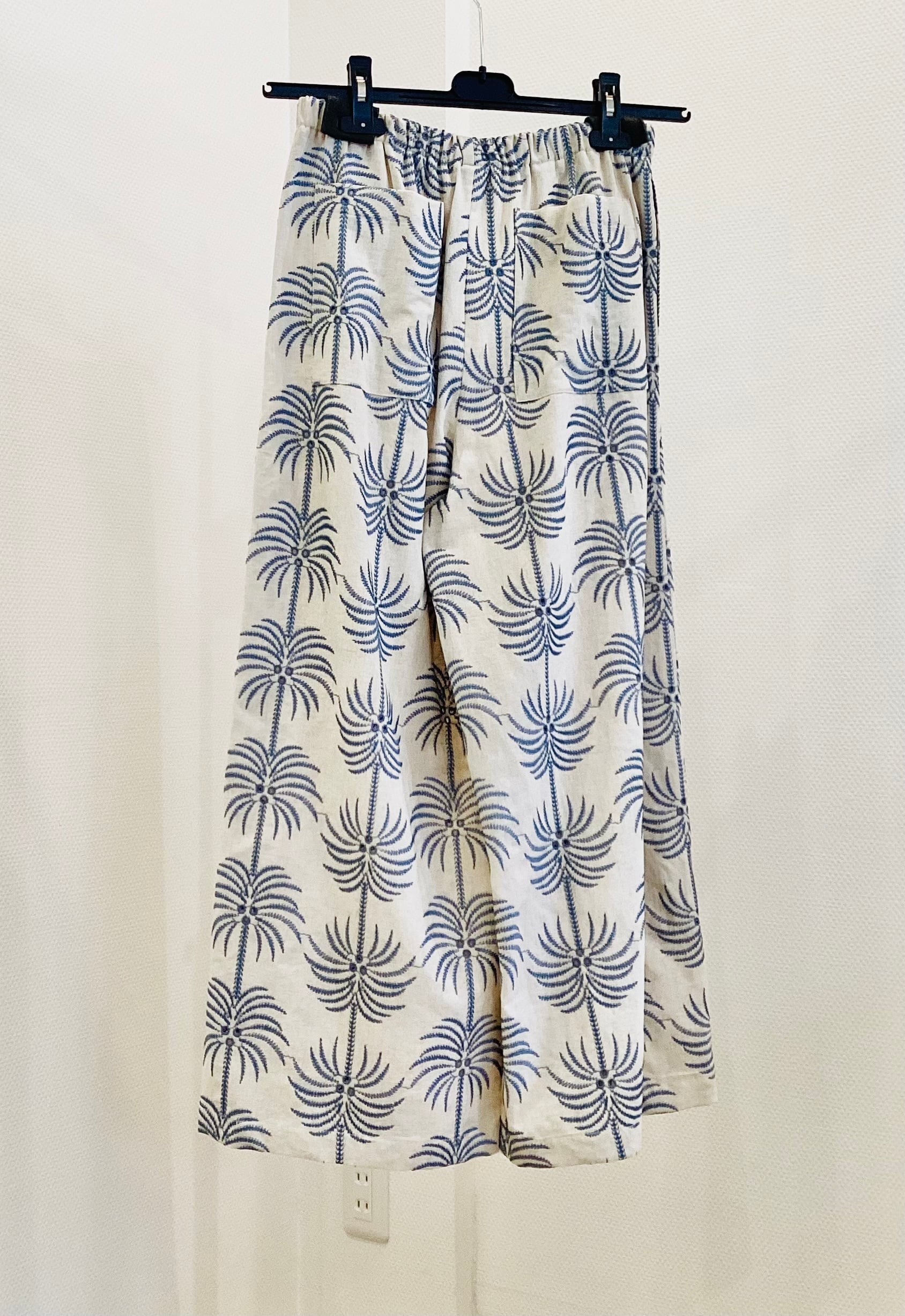 インポートらしい刺繍が目を引く綿麻ワイドパンツ。 コットンリネンの軽やかな風合いは、風をはらんで揺れるたびに涼しげ。 ワイドシルエットのラクさと、刺繍の品格が同居する、大人の休日にぴったりの一本です。 控え目だけど存在感のあるアイテムなので、シンプルなトップスでも 手抜きに見えず、更に同柄トップスとセットアップコーデにすると シャレ感たっぷりのセンスあるスタイルに♪ 今シーズンの主役級ボトムですよ^_−☆ サイズ M(総ゴム) 綿 79% 麻 21%