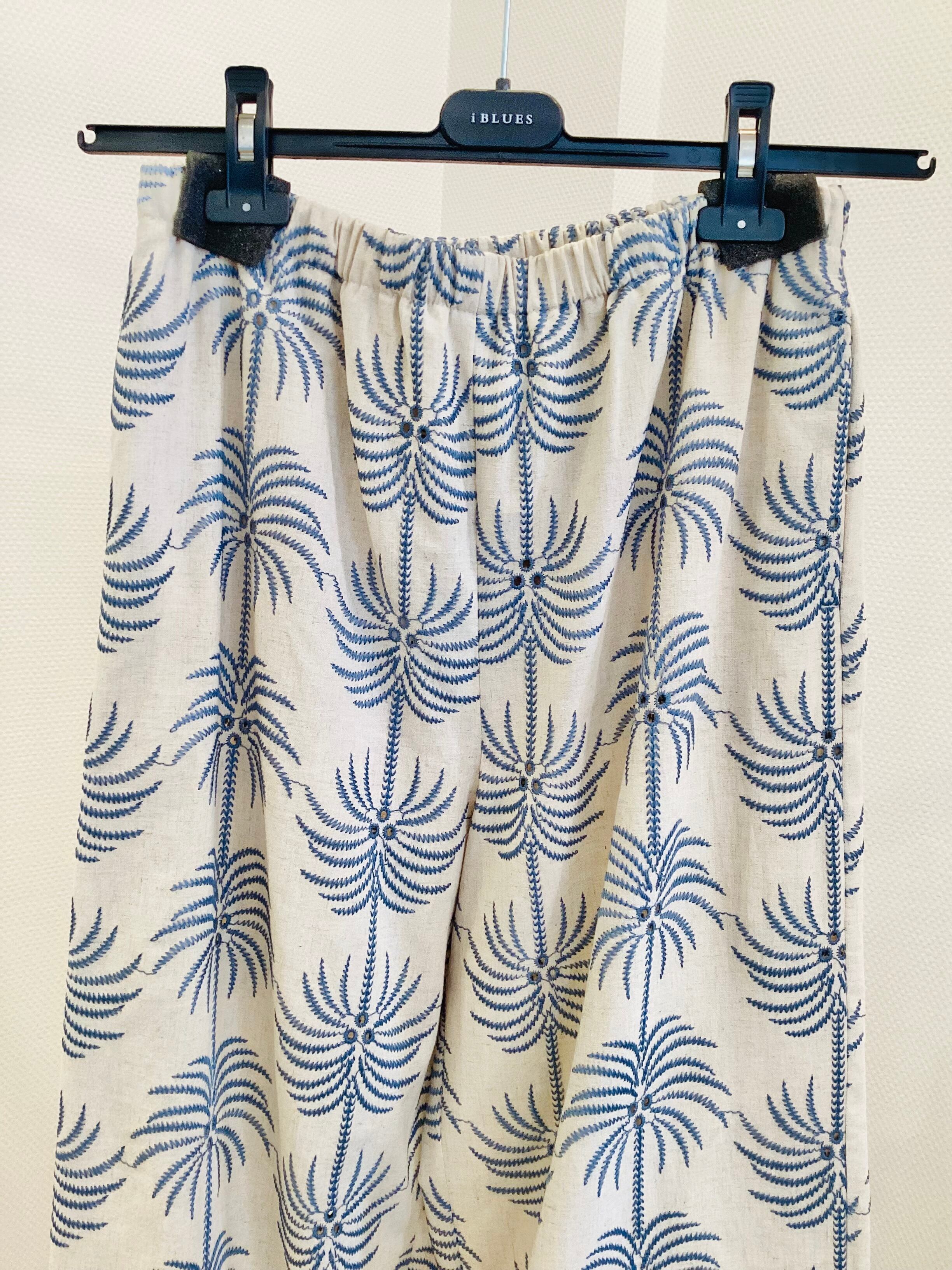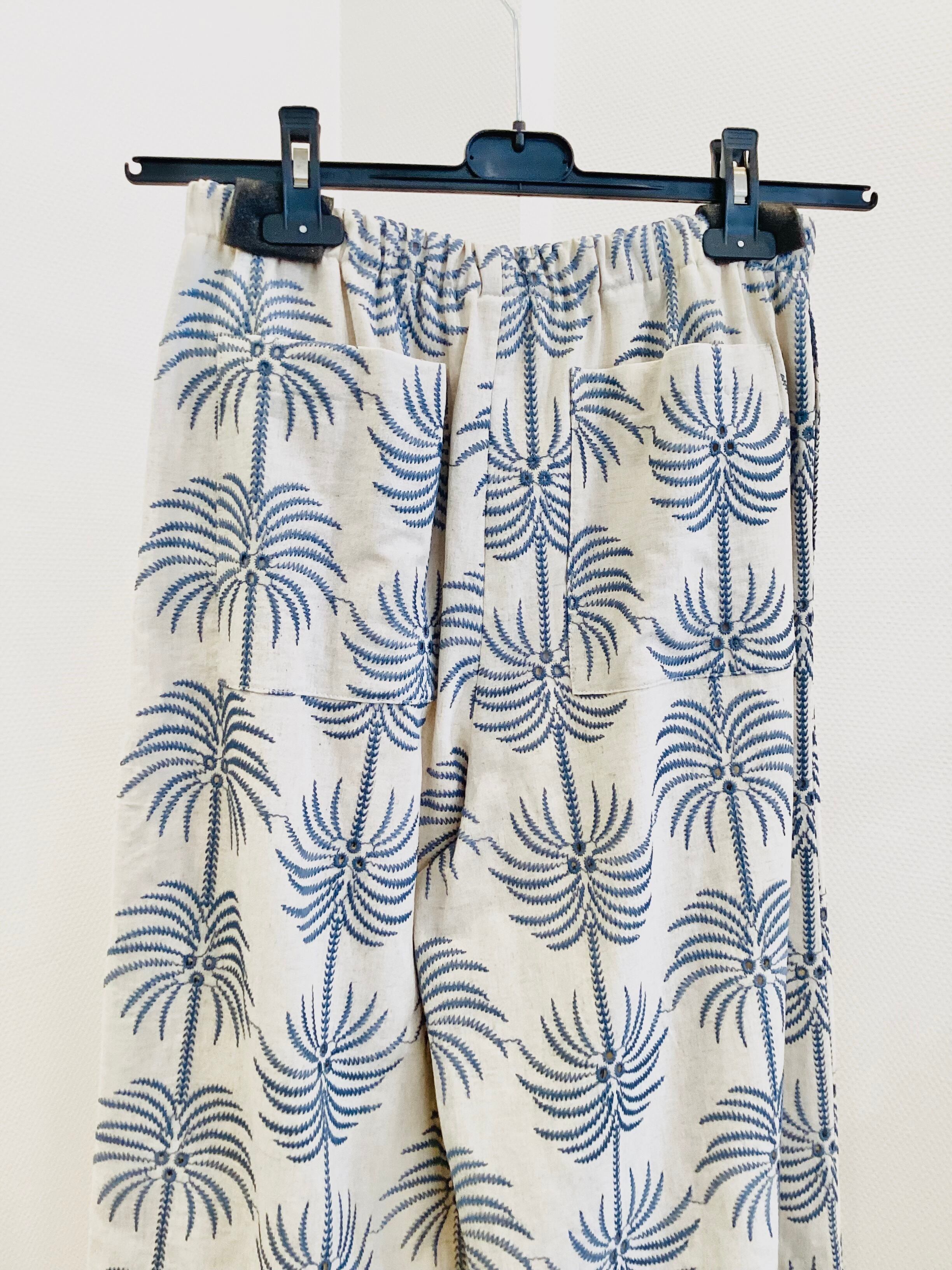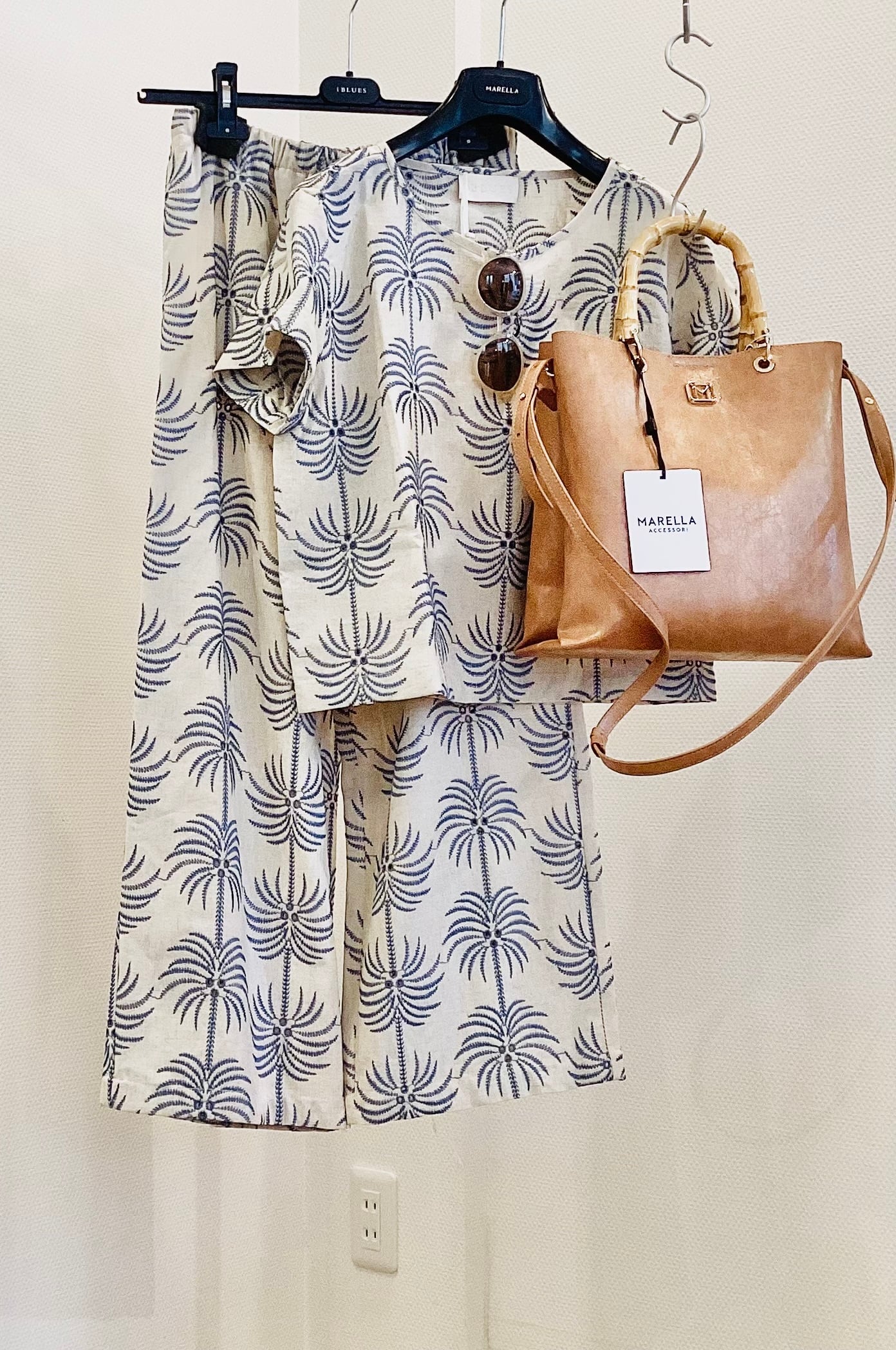 インポートらしい刺繍が目を引く綿麻ワイドパンツ。 コットンリネンの軽やかな風合いは、風をはらんで揺れるたびに涼しげ。 ワイドシルエットのラクさと、刺繍の品格が同居する、大人の休日にぴったりの一本です。 控え目だけど存在感のあるアイテムなので、シンプルなトップスでも 手抜きに見えず、更に同柄トップスとセットアップコーデにすると シャレ感たっぷりのセンスあるスタイルに♪ 今シーズンの主役級ボトムですよ^_−☆ サイズ M(総ゴム) 綿 79% 麻 21%