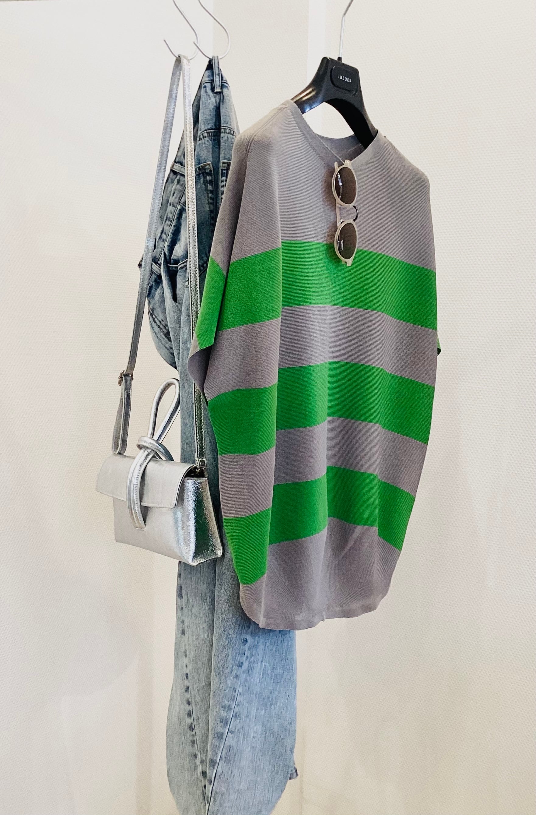 継ぎ目のない、究極のシームレス・プルオーバー♪ ホールガーメントが叶える、体に滑らかに寄り添うノンストレスな快適さ。 定番のボーダーを、シックなグレーとアクセントのグリーンの配色で 都会的で大人っぽい表情に。 5分袖は二の腕を美しくカバーしつつ、これからの季節にぴったりな清涼感を叶えます。 洗練された大人のリラックス・モードスタイルに最適な アイテムですよ^_−☆サイズ フリー ポリエステル 55% 綿 45%